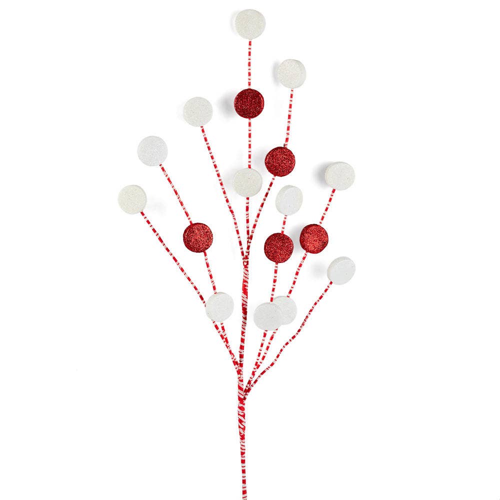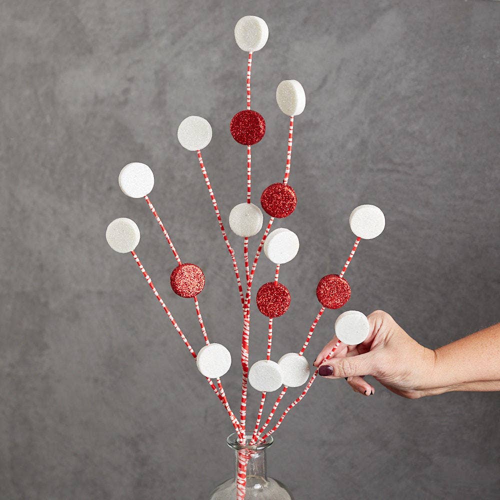Add this Artificial Christmas Glitter Candies Spray in classic red and white to your holiday decor. Sparkling with seasonal cheer, the spray has glittered candy shapes and whimsical wire stems striped like candy canes-a delightful detail that sets it apart. Size: 34 inches (bottom of stem to top of tallest candy)Perfect for adding a touch of sparkle to Christmas trees, garlands, wreaths, or floral arrangements, this spray helps create a magical holiday decoration. Whether placed in a centerpiece or tucked into seasonal decor, it brings a touch of peppermint magic to any Christmas display.