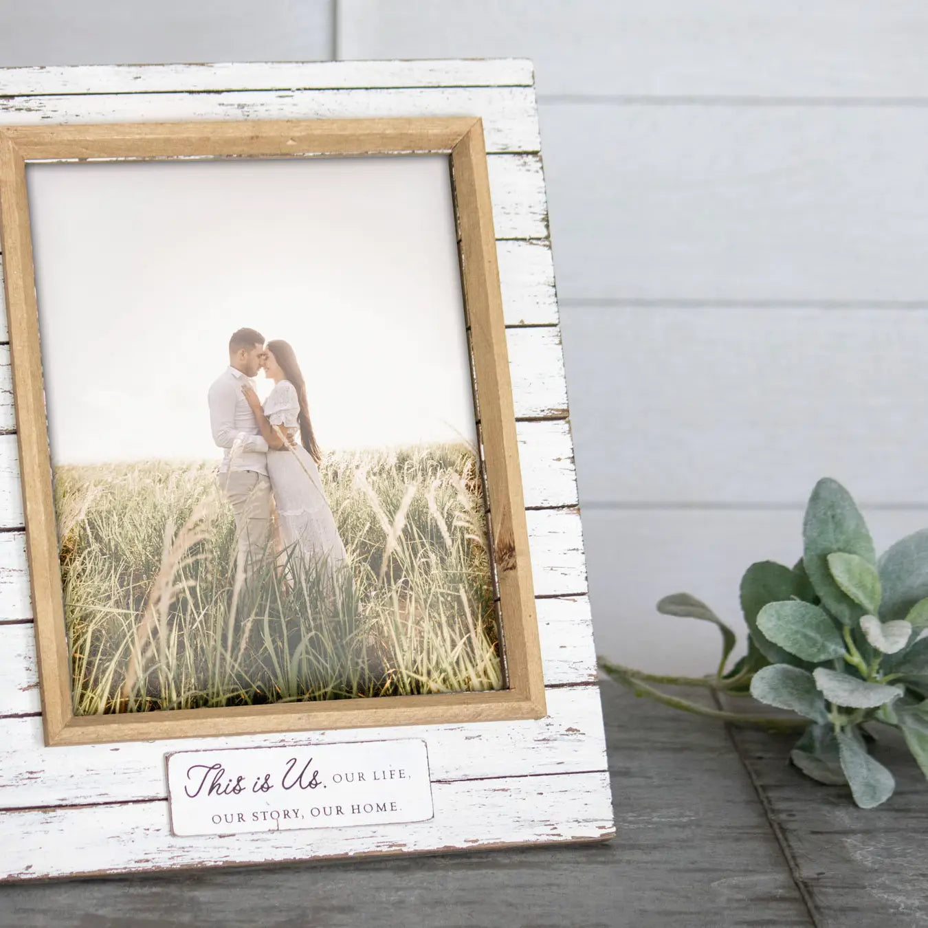 Simple and sweet, this 8x10 wooden photo frame features a traditional sentiment: "This is Us. Our life, our story, our home." The phrase is on a dimensional plaque with a natural wood border that pairs beautifully with the white shiplap inspired background. The glass front will help to protect your photo from dust and other damage. A timeless accent for your shelf, desk, side table, mantel, or hung on a wall for a versatile display anywhere in your home. -Glass front included to protect photo. -Holds up to an 8x10 size photo. Easy tab back allows convenient access to change out photo. -This frame has an easel back and 2 sawtooth hangers on the back allowing for portrait or landscape orientation whether hanging or on a tabletop surface. Due to the phrasing, this frame is better suited for portrait orientation. -Dimensions: 11 x 0.5 x 14"H -Featuring a "This is Us" phrase on a dimensional plaque with a natural wood border that pairs beautifully with the white shiplap background.
