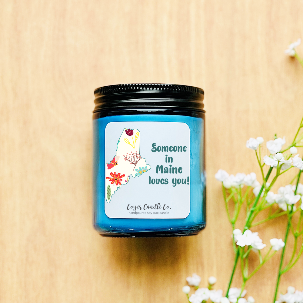 The Cobalt candles are dye-free, 100% soy wax, and cotton wicks with an approximate burn time of 50 hours. All scents are made with phthalate-free fragrances. Choose your jar and scent then let us know which state to highlight!