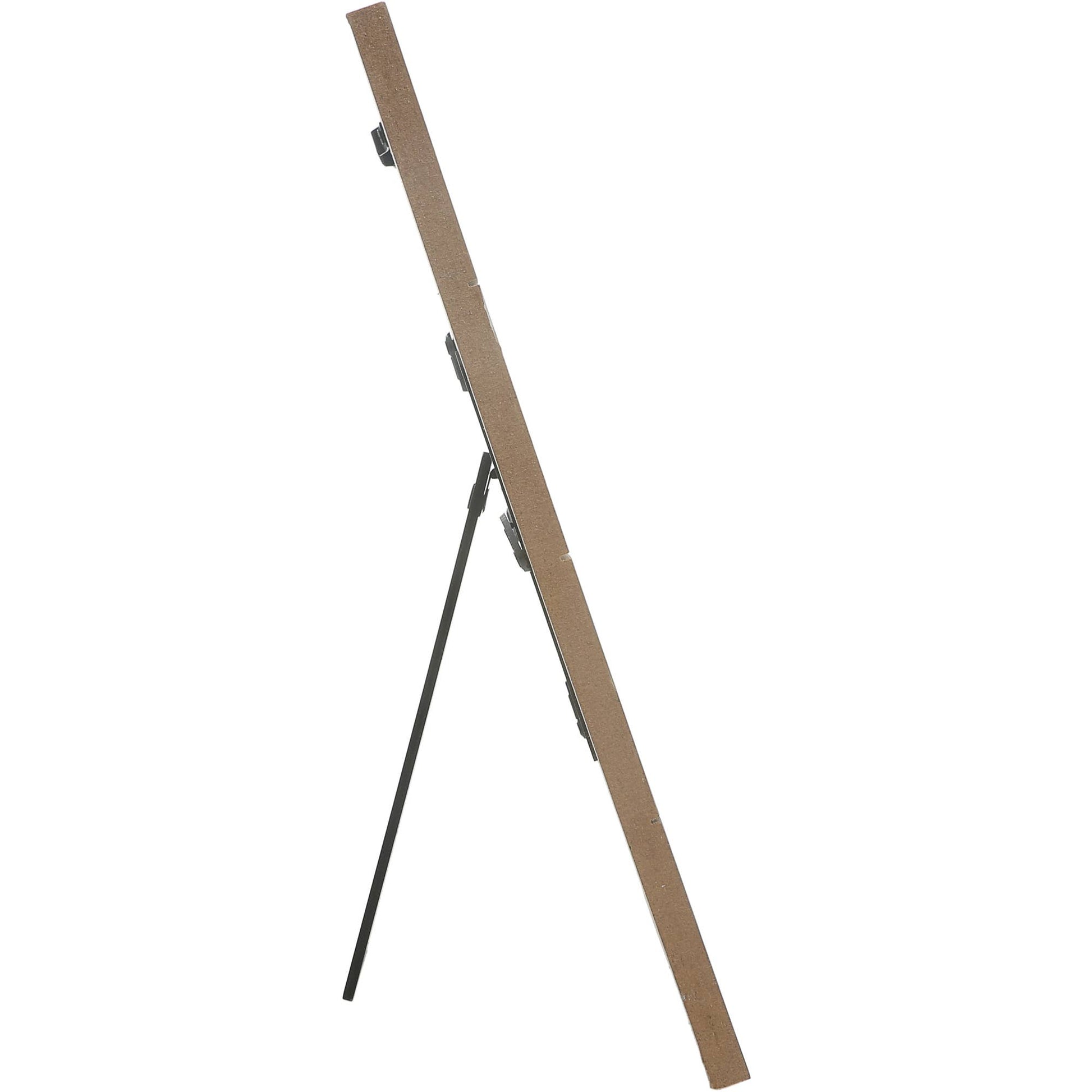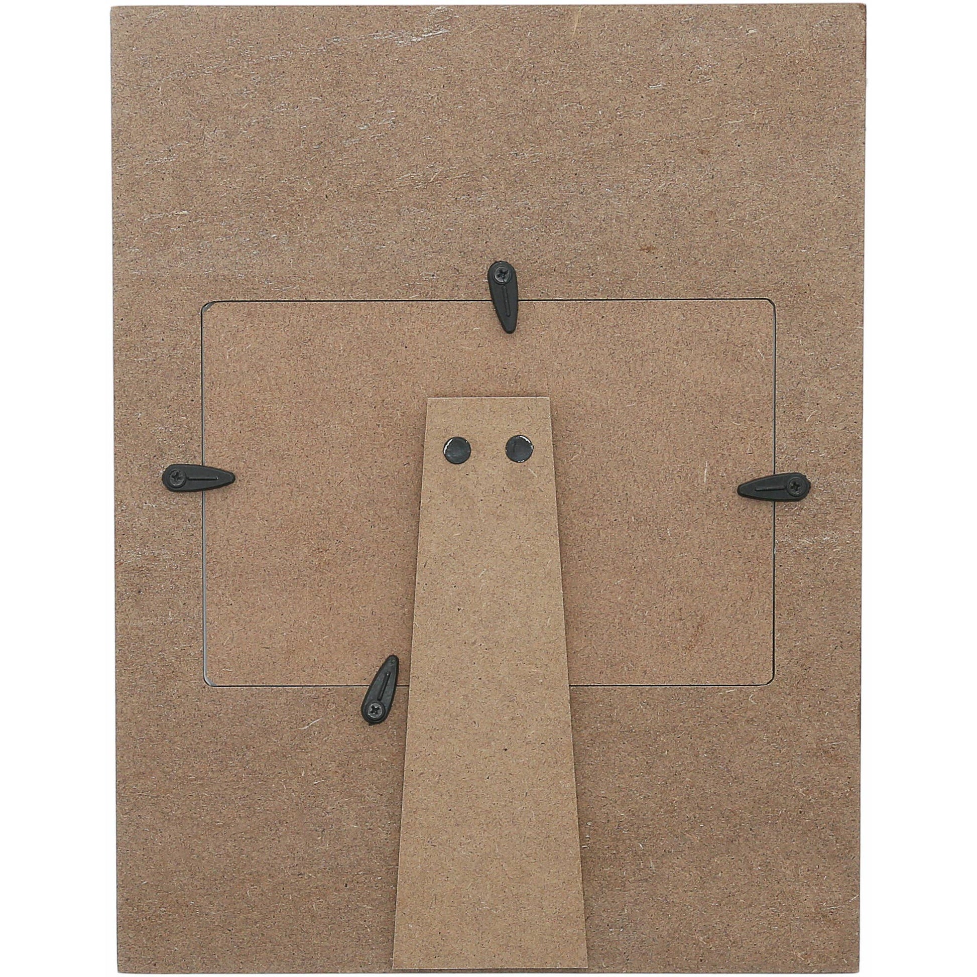7.75" long x 10" tall vertical easel back four shiplap paneled picture frame holds a horizontal 6" x 4" photograph. The outer edges of the photo holder are rounded. The backside is tan in color and features four sturdy thick black plastic turn knobs for image replacement. Materials include galvanized metal, MDF, glass, and plastic. The star in the top section of the frame is metal and the panel is dark gray. The second section is a cream color and holds the top half of the photograph. The third section is a beige color and keeps the bottom half of the picture. Finally, the bottom gray area has a white "Meant To Be A Dad" screen-printed sentiment. The overall look of the frame is rustic, modern, and whitewashed. Wipe with a dry cloth. It is safely packaged in a protective die-cut box.