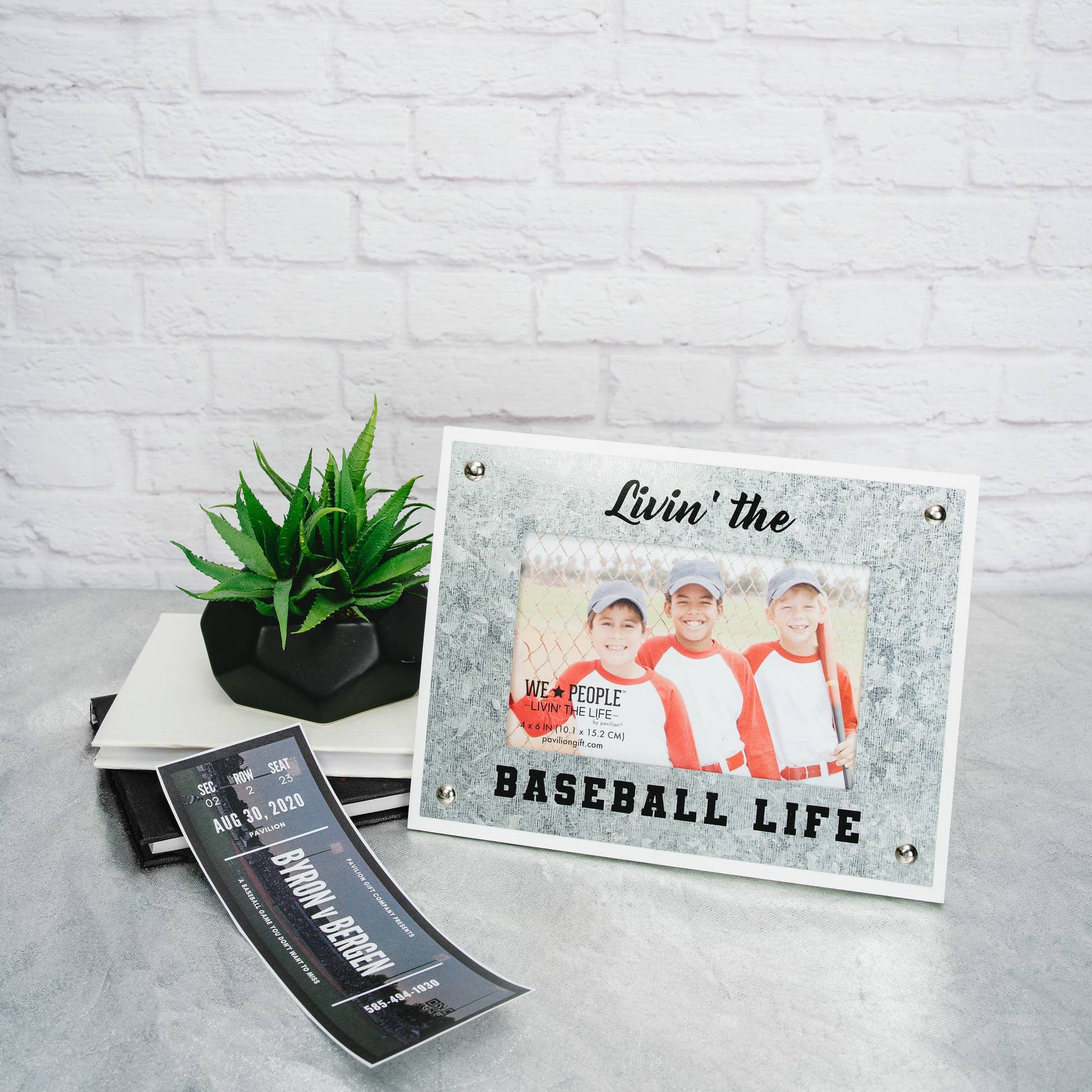 Photo frame, packaged in a plain box, is made from MDF, metal, and glass, fits a 4x6 inch photo, and features an easel back for displaying. "Livin' The Baseball Life" text is printed around the replaceable photo. Remove dust by wiping with a soft cloth. Great for those who wish to show their love of baseball.