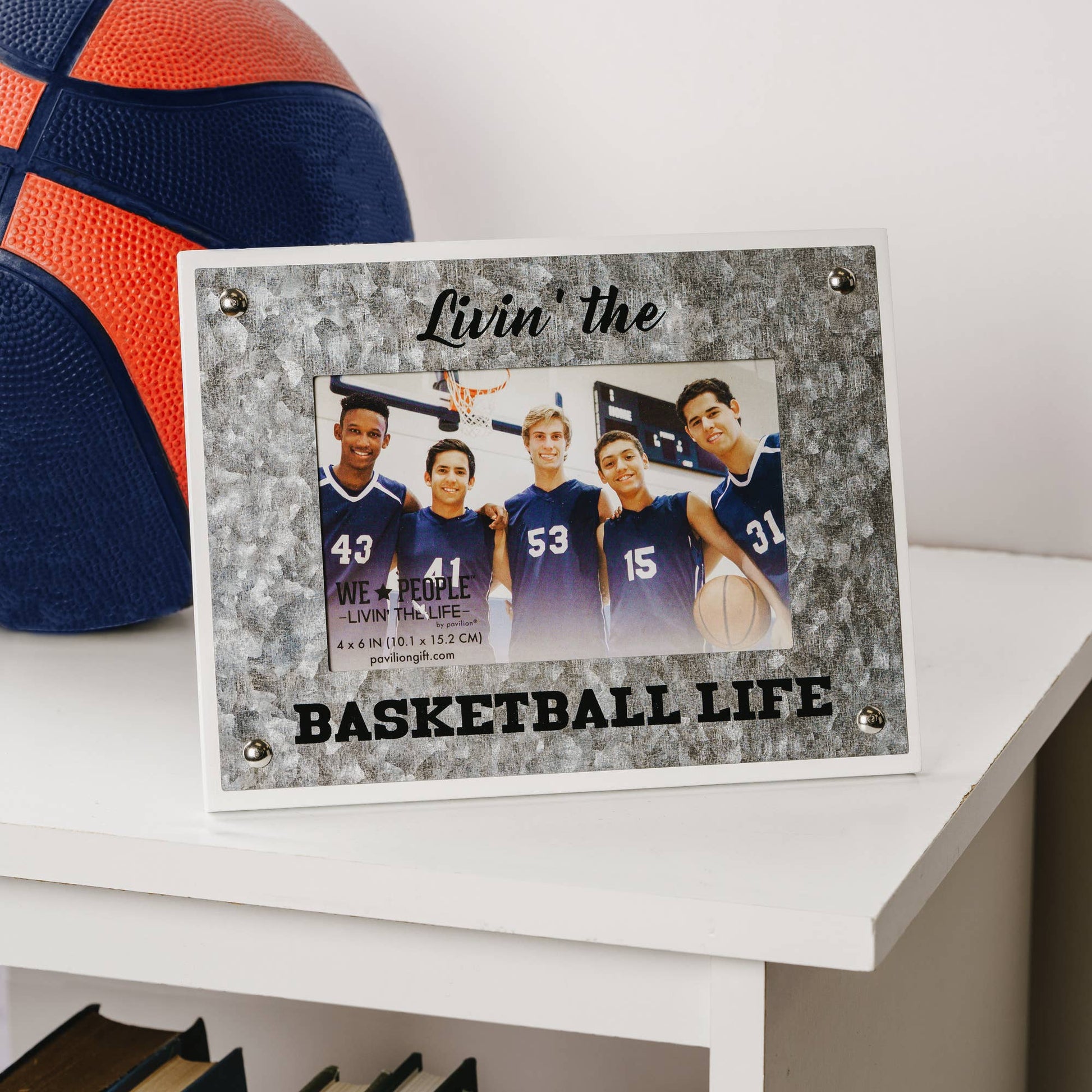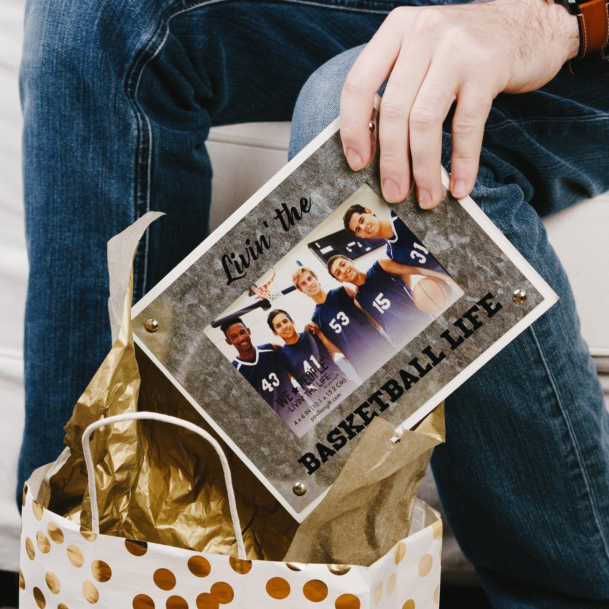 This horizontal frame measures 8.5" long x 6.5" tall holding a 4" x 6" adored photo memory. Packaged safely in a die-cut box. Wood veneer and MDF is white, galvanized metal with secured pins is silver, constructed with a glass front. "Livin' The Basketball Life" black decal sentiment printed onto the metal layer. The sturdy paperboard backing has four metal turn tabs for photo replacement. Hinged easel back for tabletop display or metal triangle for wall display. Dust with a damp or dry cloth as needed. . Sports memories are treasured and held near and dear. Frame the perfect high school, MBA, or outdoor active (knockout, around the world, H.O.R.S.E., relay, and more) basketball game moments from the court. Great for gifting to a coach or teammates. .