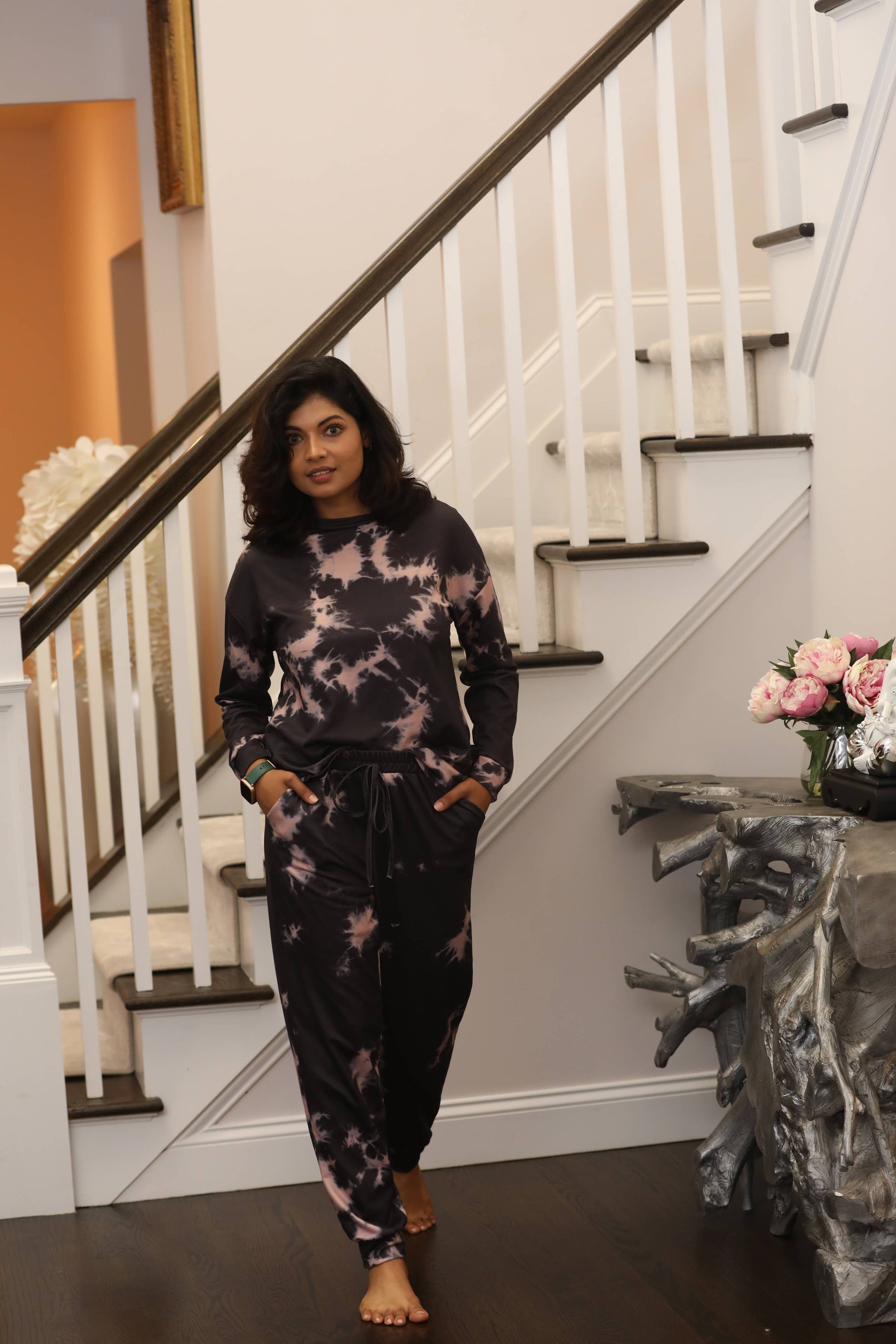 Black & Pink Tie-Dye Long-Sleeve Crewneck Top & Joggers