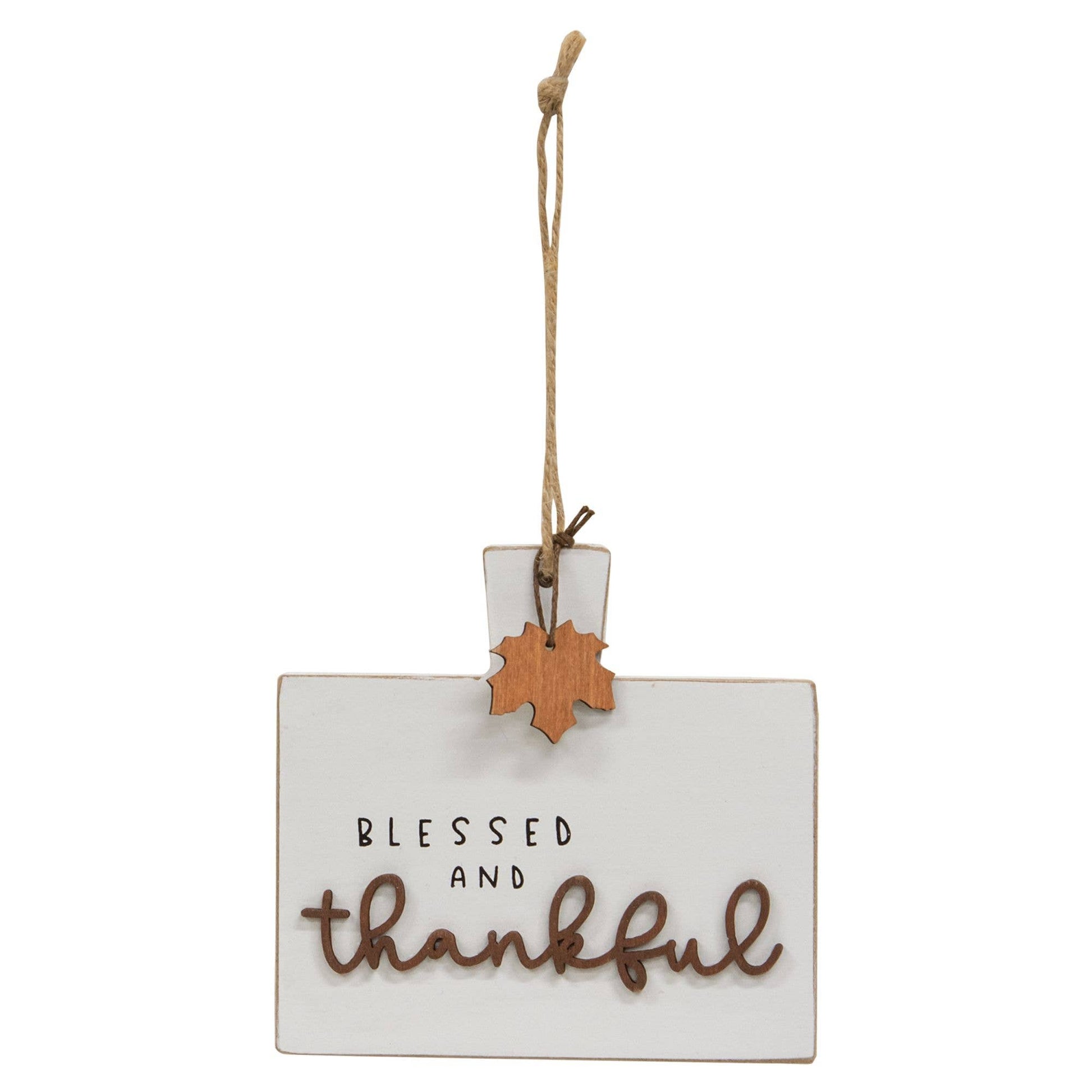 Bring blessings into the farmhouse kitchen this Fall with the Blessed and Thankful Cutting Board Sign Ornament. This solid wood ornament features a wide cutting board shape with white finish and distressed edges. It reads ‘Blessed and thankful’ and the word ‘thankful’ is in dimensional script. The ornament is topped with a jute hanger and a cute maple leaf cutout with a red stain finish. This ornament looks great hanging from cabinet knobs or kitchen hooks. Measures 4.25" high by 4.5" wide with a .25" depth.
