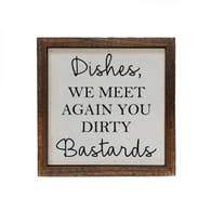 Dishes We Meet Again You Dirty Bastards Sign. The signs are build into a wooden box frame with a rustic touch. Signs are hung directly off the frame or will stand up right on a table or shelf.