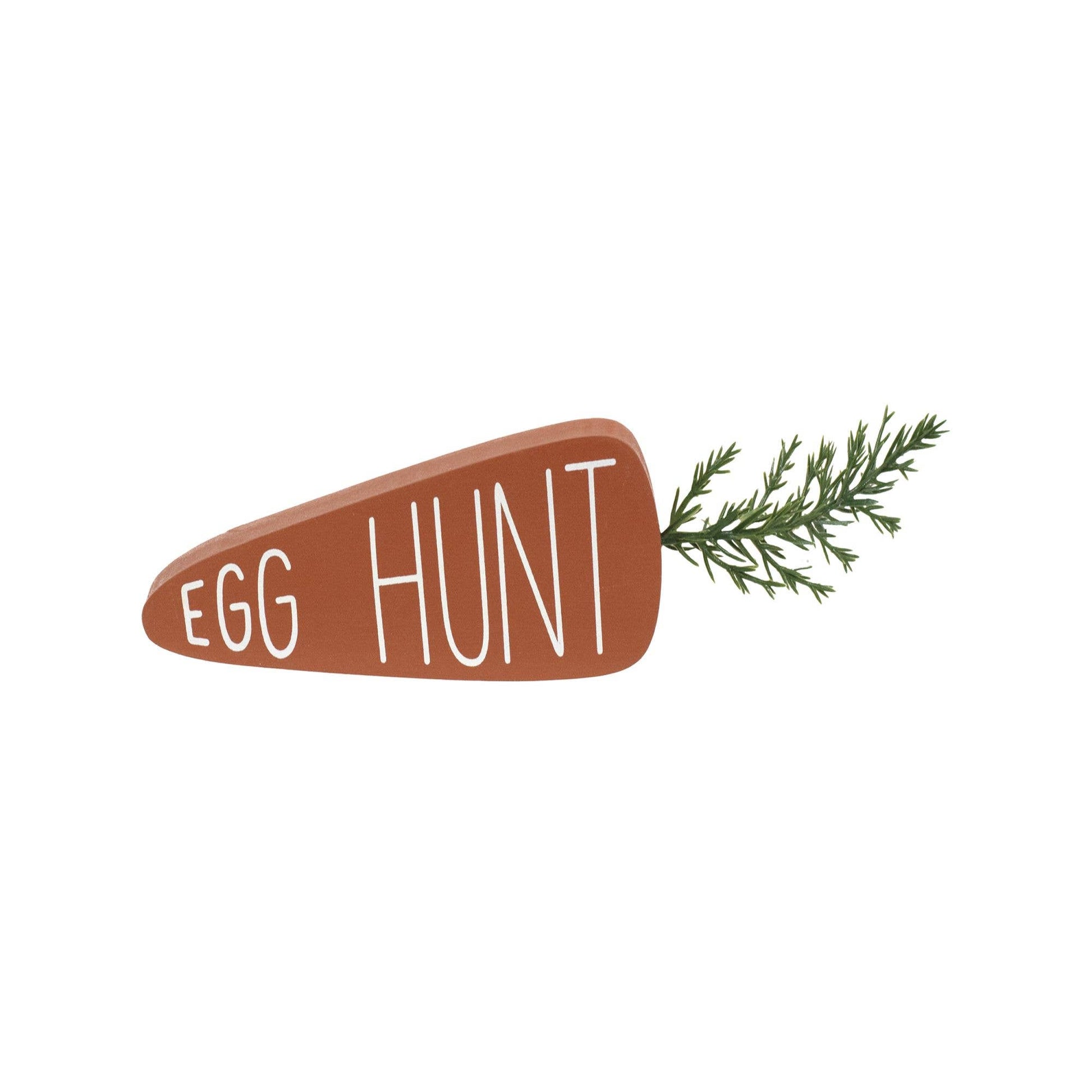The Easter Words Carrots are an assortment of five decorative wooden carrot figurine sitters with an orange painted finish. The carrots have textured leafy green tops and white painted lettering, reading “Hippity Hop”, “Bunny Trail”, “Hello Spring”, “Funny Bunny”, or “Egg Hunt”. The carrots display freestanding on their sides, ideal for accenting a tray, tabletop, or shelf during the Easter season. Each carrot measures 2” high by 9.5” wide by .75” deep.