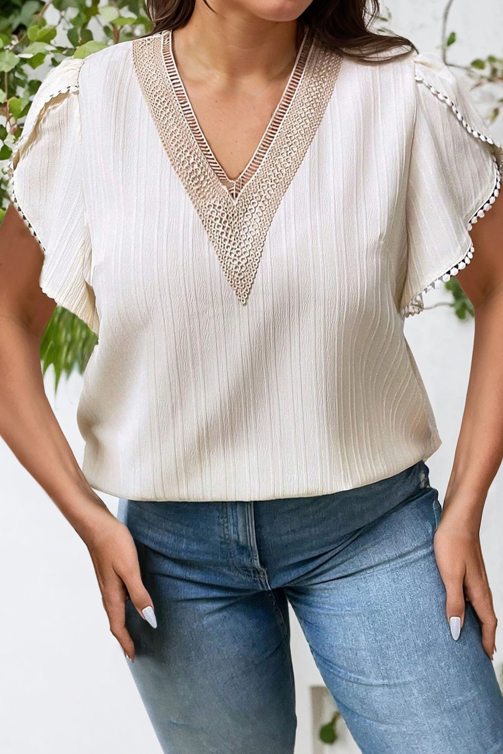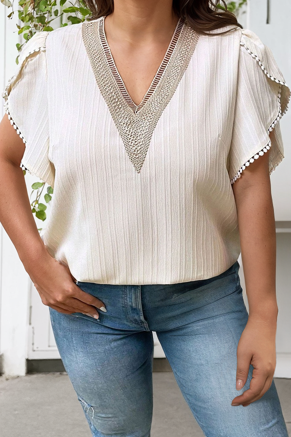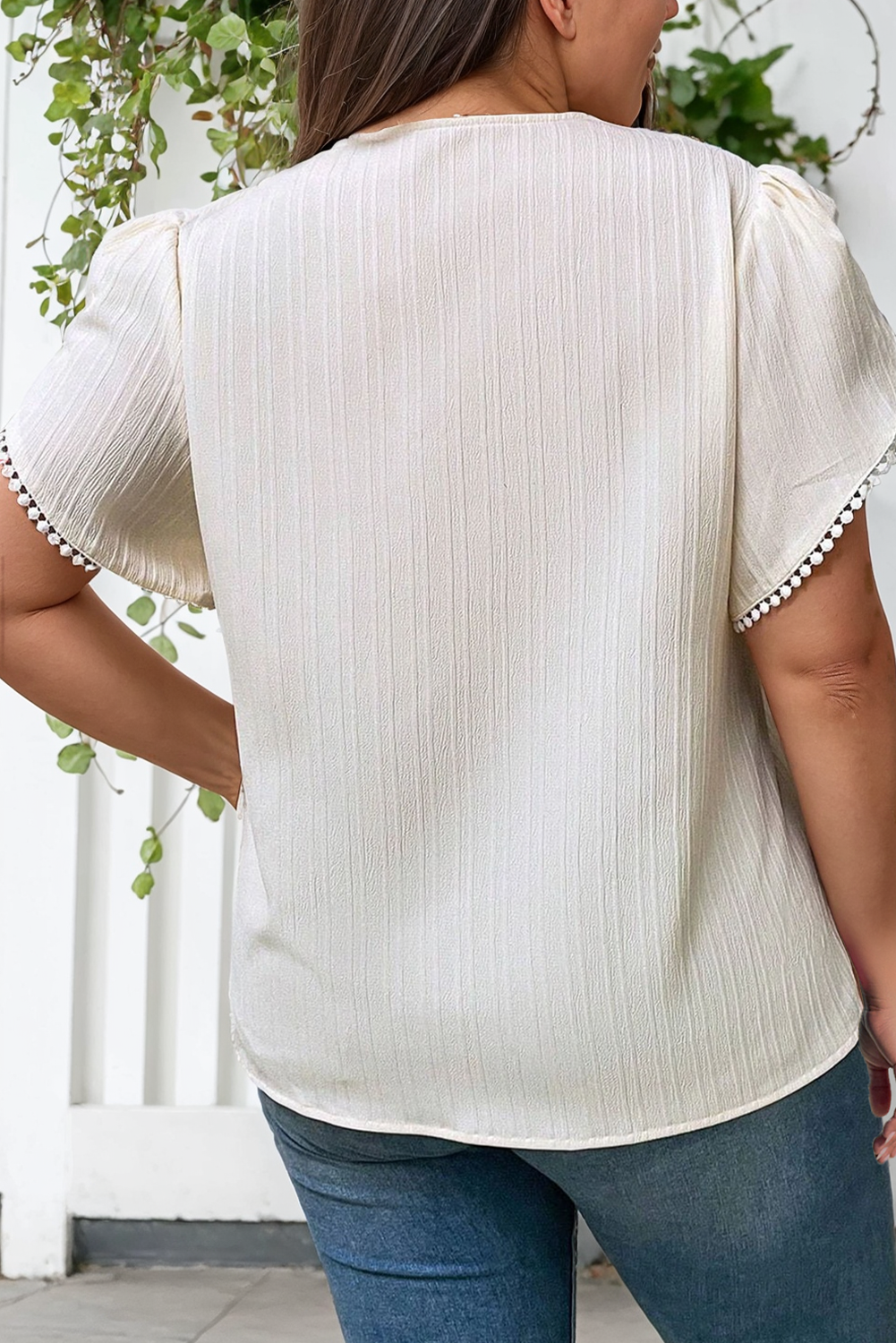 Embroidered V Neck Wrap Sleeve Textured Plus Size Blouse: Beige