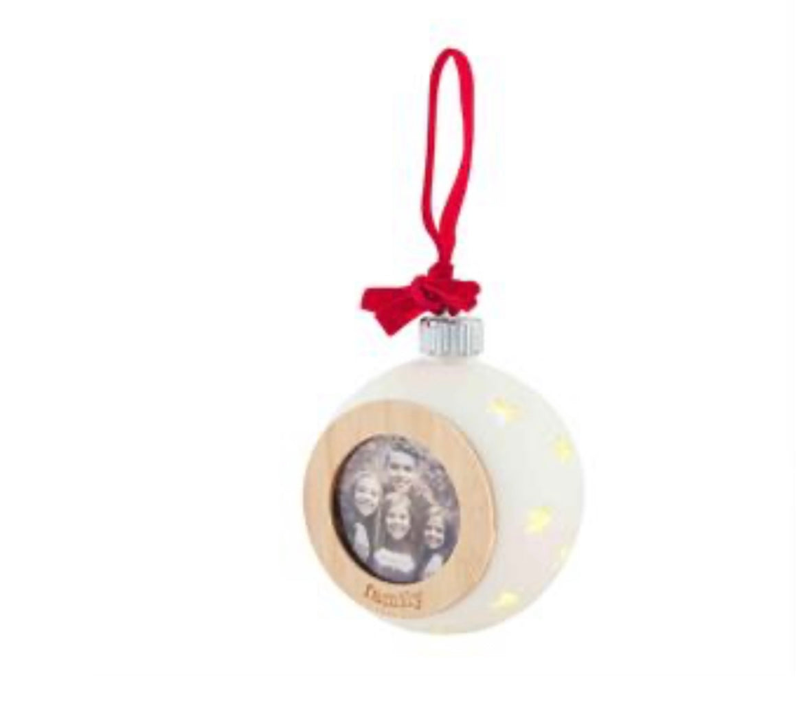 Light-up porcelain ball ornament with star cut-outs features layered wood disc frame. Batteries included.