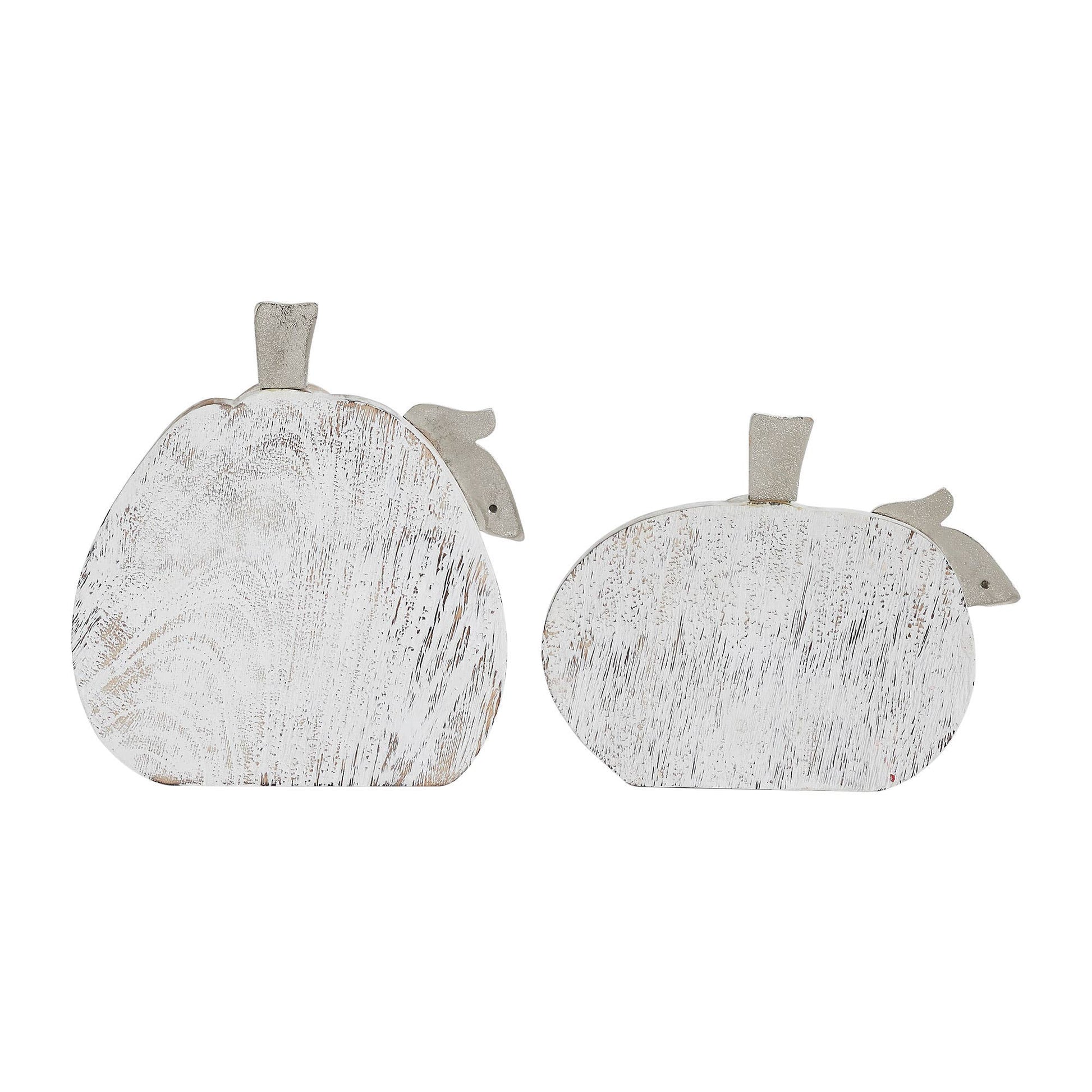 Embrace the gentle whisper of autumn with the VHC Brands White Wash Farmhouse Wooden Pumpkin Set of 2, a captivating duo designed to infuse your space with rustic elegance. Each pumpkin, meticulously crafted from warm whitewashed tropical wood, boasts a subtly distressed finish that evokes the cherished patina of time, creating a beloved vintage charm. Delicately poised aluminum leaves and slender stems shimmer with a soft, silver gleam, offering a sophisticated contrast to the serene blend of whitewash and light brown tones. These beautifully proportioned pumpkins, measuring 9x8.5x1.25 inches and 7x8.5x1.25 inches, are more than mere decorations; they are tactile invitations to a tranquil farmhouse or cozy cottage-core aesthetic, beckoning warmth into any fall or Halloween display. Imagine these charming companions gracing your entryway console, adding a welcoming touch to your kitchen mantel, or bringing a serene glow to a bedside table. Their versatile beauty makes them a seamless fit for any room - from t