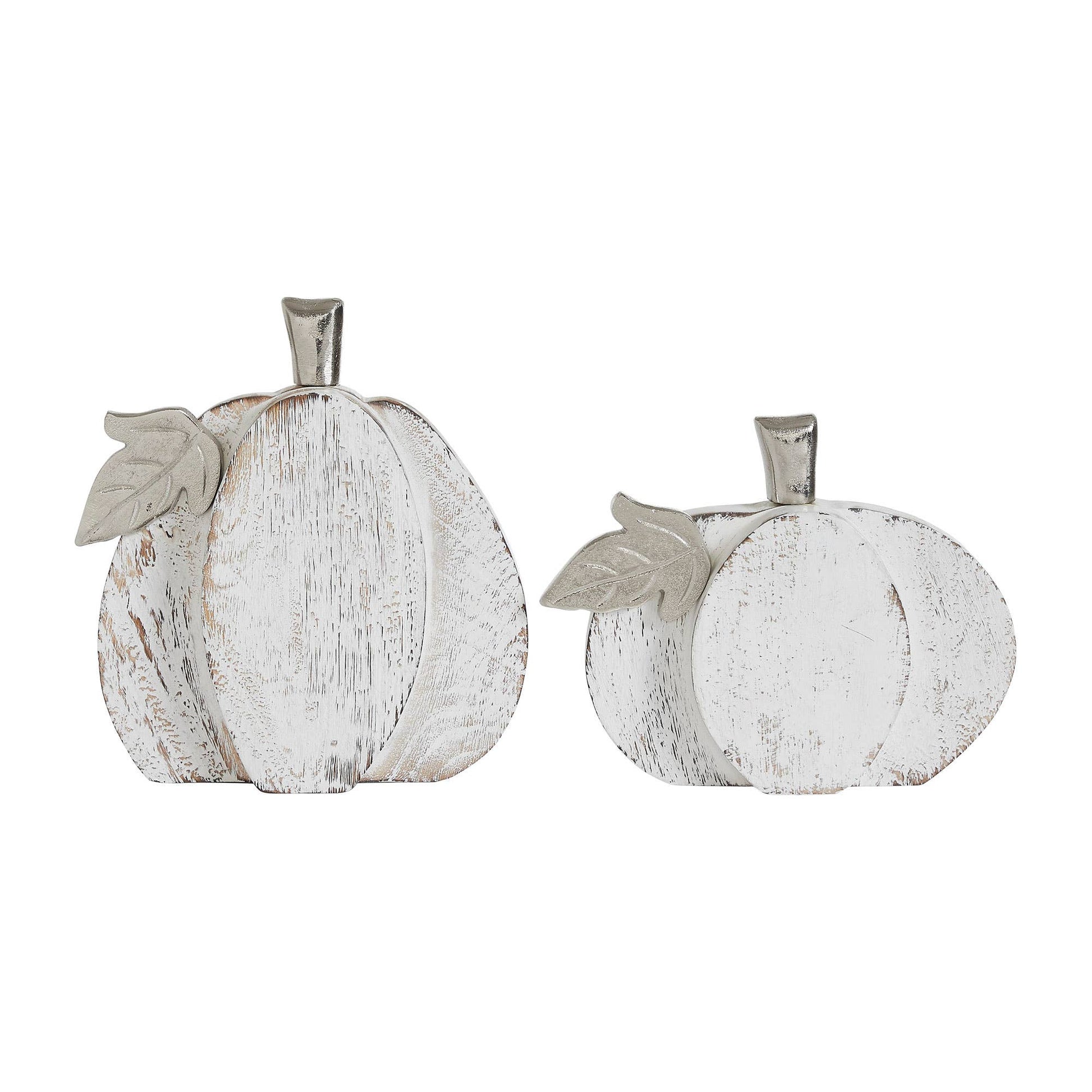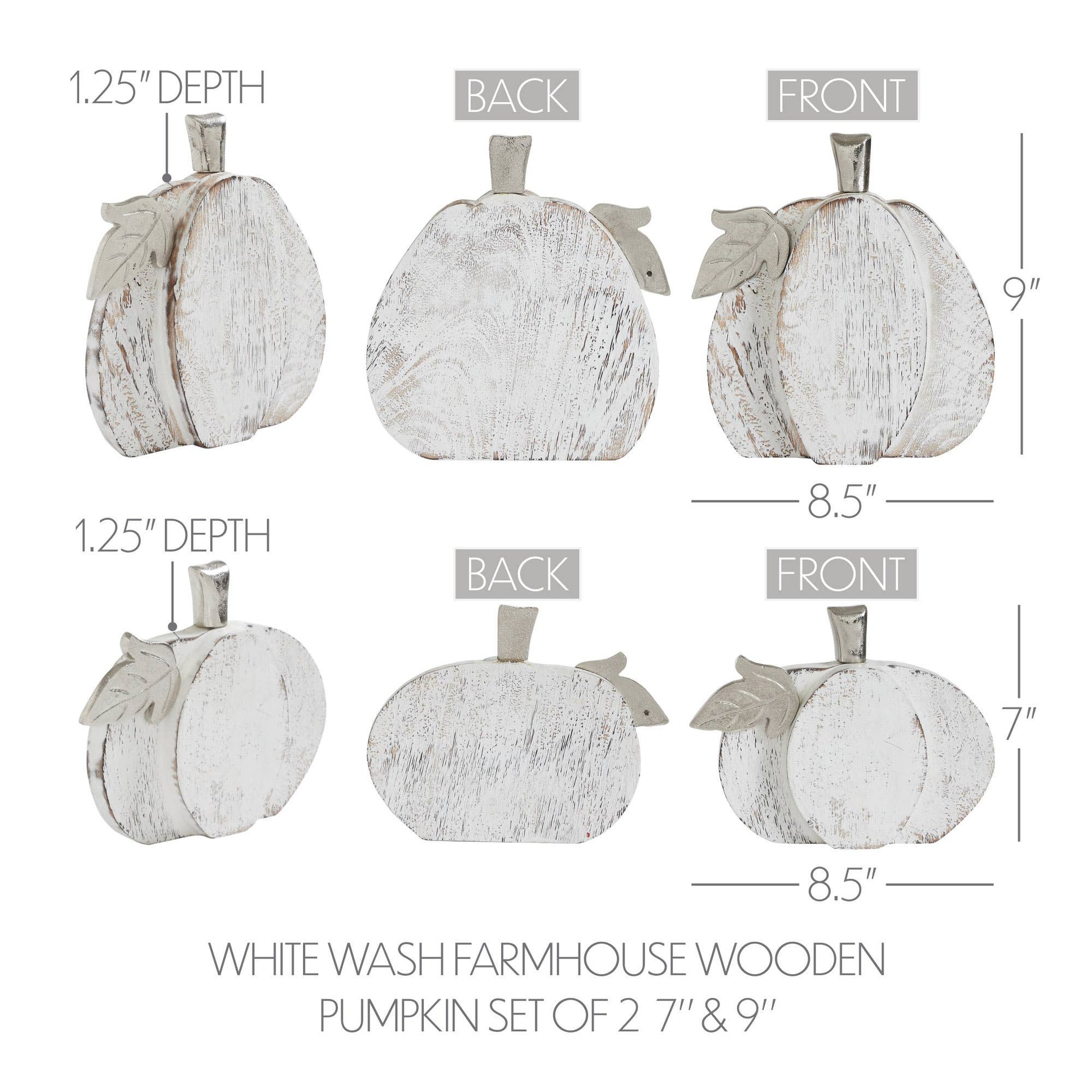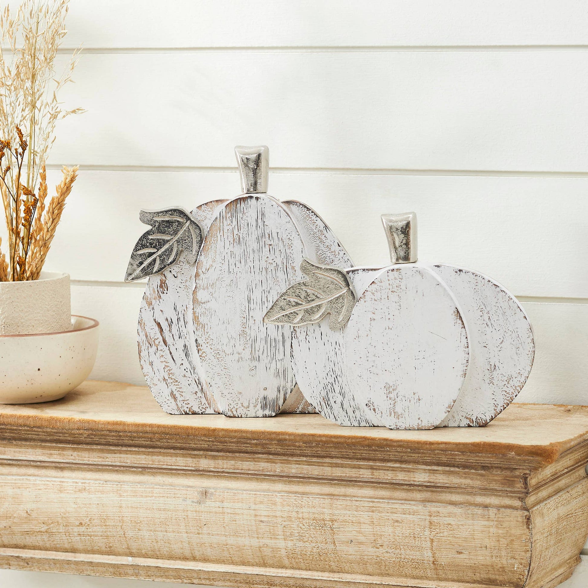 Farmhouse White Wash Wooden Pumpkin Set (2-Piece, 7 & 9 inches) - Rustic Autumn Fall Harvest Home Decor