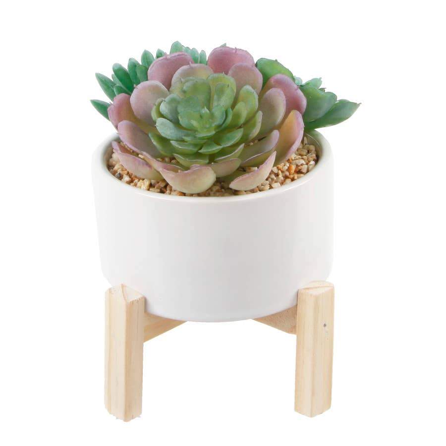 Stand by me! Place these faux succulent planters anywhere in your home to create an indoor Oasis. Hand-crafted by Artisans, our ceramic planter on wood stand will help upgrade your plant game in style. Made of ceramic and painted white with a smooth finish, this white, 4.75” x 4.75” x 8” tabletop planter will add a bit of chic antiquity to your living space. Faux succulents are included, so you never have to worry about watering real plants again! Beauty without the pain of caring for real plants!