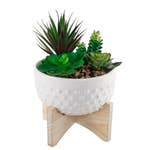 Stand by me! Place these faux succulent planters anywhere in your home to create an indoor Oasis. Hand-crafted by Artisans, our ceramic planter on wood stand will help upgrade your plant game in style. Made of ceramic with a Hobnail pattern and a glossy white finish, this 6.75” x 6.75” x 10.75” tabletop planter will add a bit of chic nature to your living space. Faux succulents are included, so you never have to worry about watering real plants again!