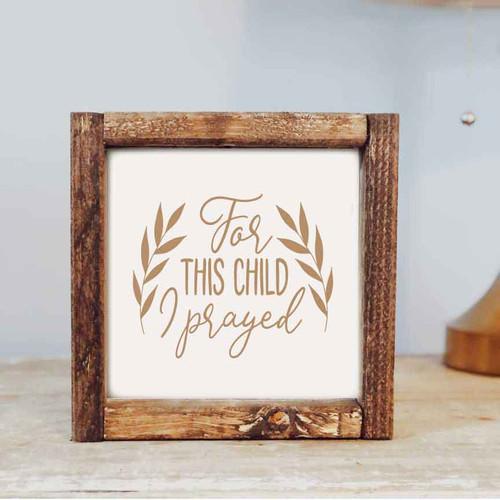 For This Child I Prayed Sign. The signs are built into a wooden box frame with a rustic touch. Signs are hung directly off the frame or will stand up right on a table or shelf.