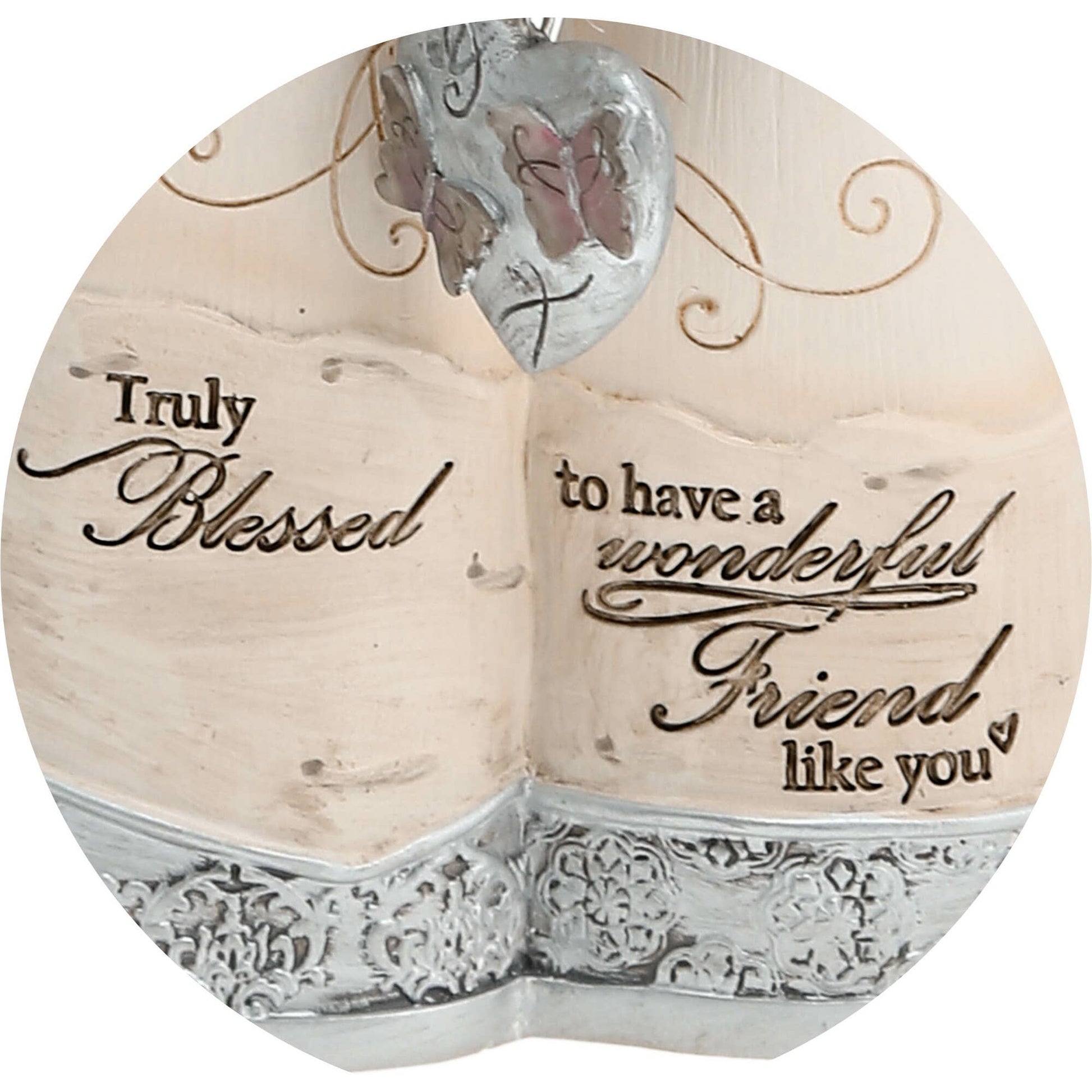 5" angel figurines, packaged in a beautiful silver accented gift-to-go printed box, are made from polyresin. This darling pair of angels makes for the sweetest sentimental piece. "Truly Blessed To Have A Wonderful Friend Like You" text is debossed and painted onto the front of the angel, alongside an intricate silver design and heart. One brown haired angel and one blonde haired angel are jointly holding a heart decorated with pretty pink butterflies. There are foam pads on the bottom to prevent surfaces from being scratched. Dust with a dry cloth. This angel is a beautiful sentimental gift to give to a special friend in your life. Your friend will adore this sweet gift with the inspirational message on it. She will treasure this forever! .