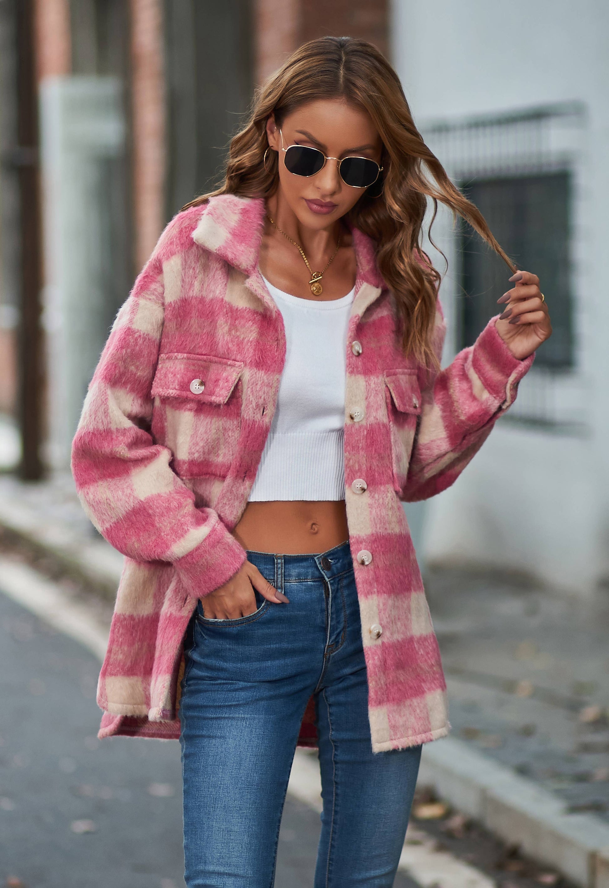 G5-JK6619 Fuzzy Plaid Button Down Shirt Jacket Shacket: Pink