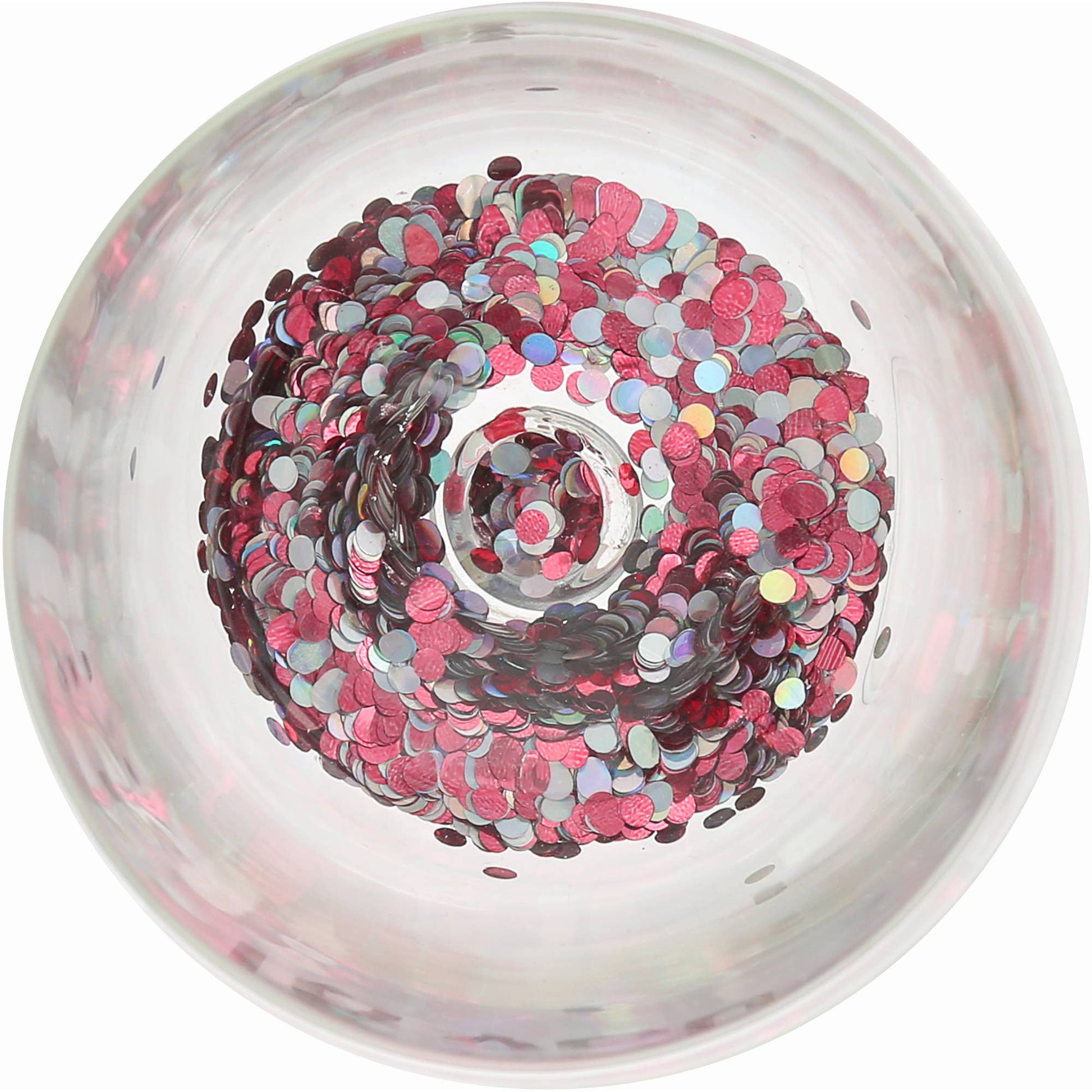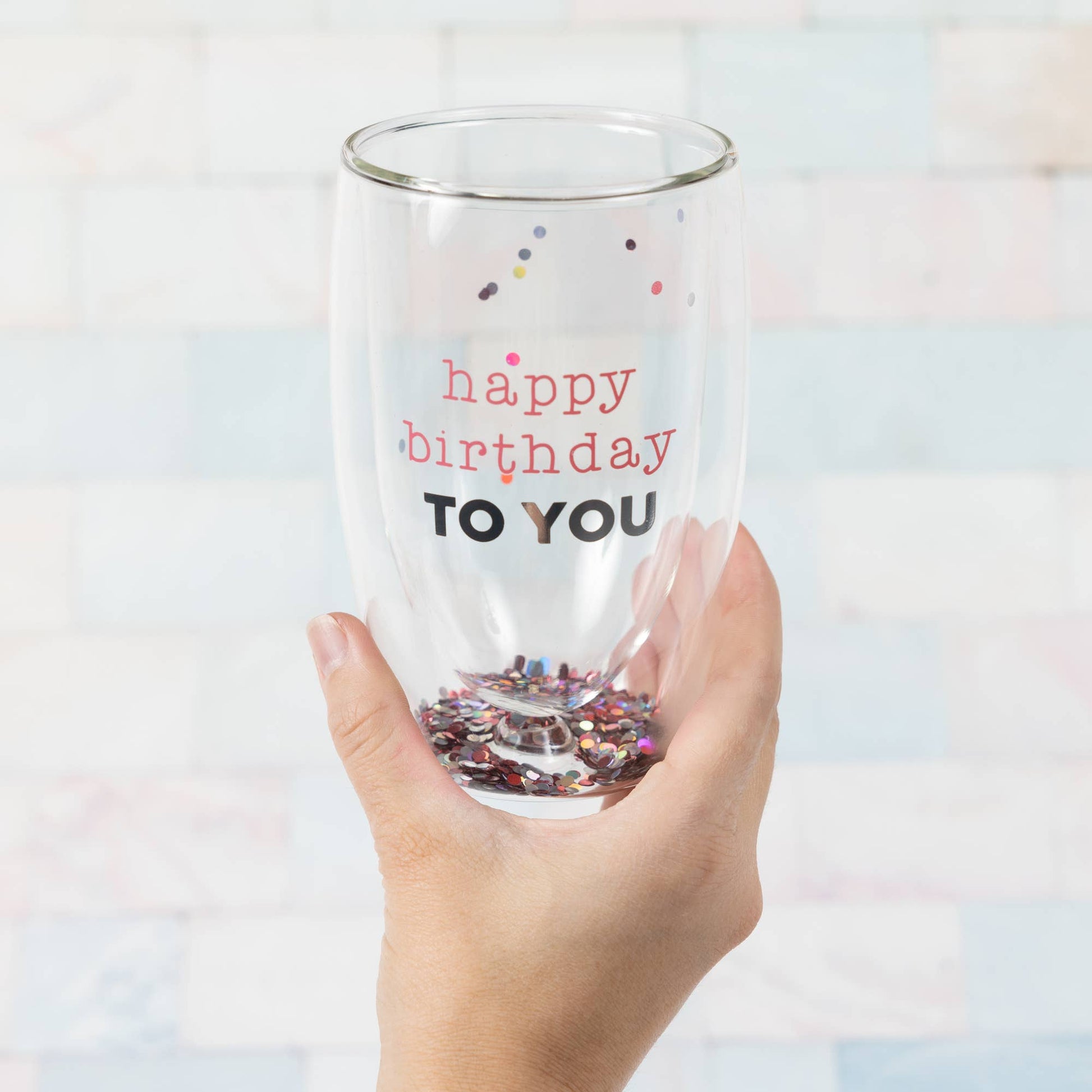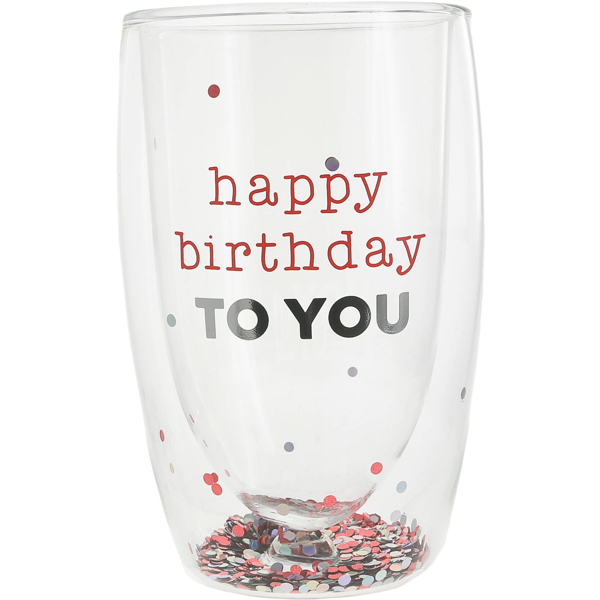 14 oz double-walled drinkware is made from borosilicate glass. Between the walls, there is freely moving confetti. The front of the glass has a pink and metallic silver sentiment, "Happy Birthday To You." The round confetti is pink and iridescent. Soft hand wash only. Do not leave soaking in water for extended periods of time. Dry immediately. It is packaged in a die-cut box. Celebrate a loved one's birthday; this unique glassware will brighten their day. Throw a party commemorating the past year and the years ahead with a cup they can use in the year ahead. Add small hair accessories, sweet chocolate treats, pens, and other desk essentials to display this unique glass for the year. An added bottle of Merlot, Riesling, Chardonnay, Gewürztraminer, Sauvignon Blanc, Malbec, Zinfandel, Pinot Grigio, and red or white wine lovers brings this item to its prime.