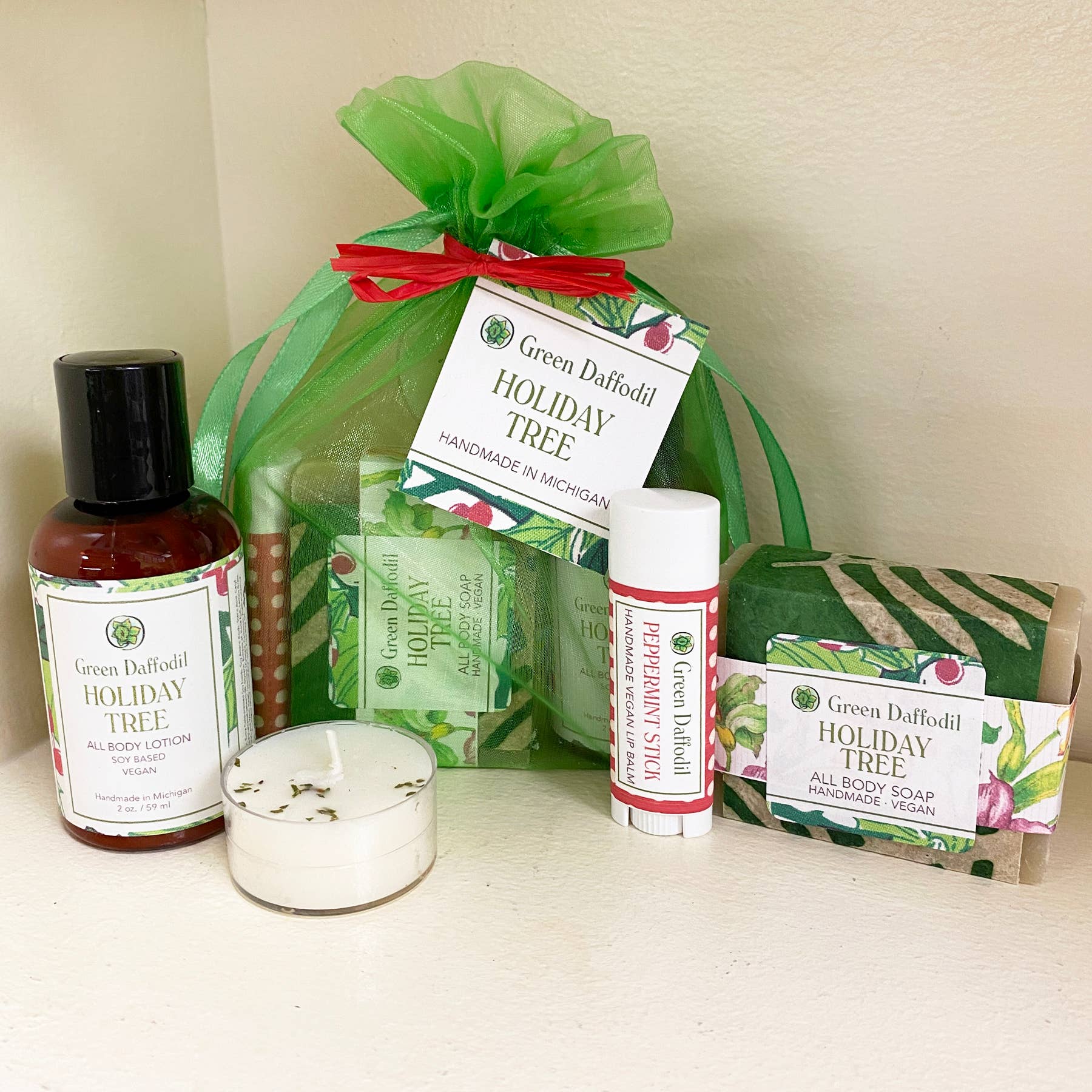 Smells just like a freshly cut Blue Spruce, ready to be decorated! Deep woods pines, with a slight smoky undertone! Each set contains a Holiday Tree individual soy candle tea light, a bar of soap, a mini soy lotion bottle, and a tube of Peppermint Stick flavored lip balm. All these goodies are beautifully packaged in a silk organdy bag and finished with ribbon and hang tag! Note the festive Holiday labels to add to the Christmas spirit.