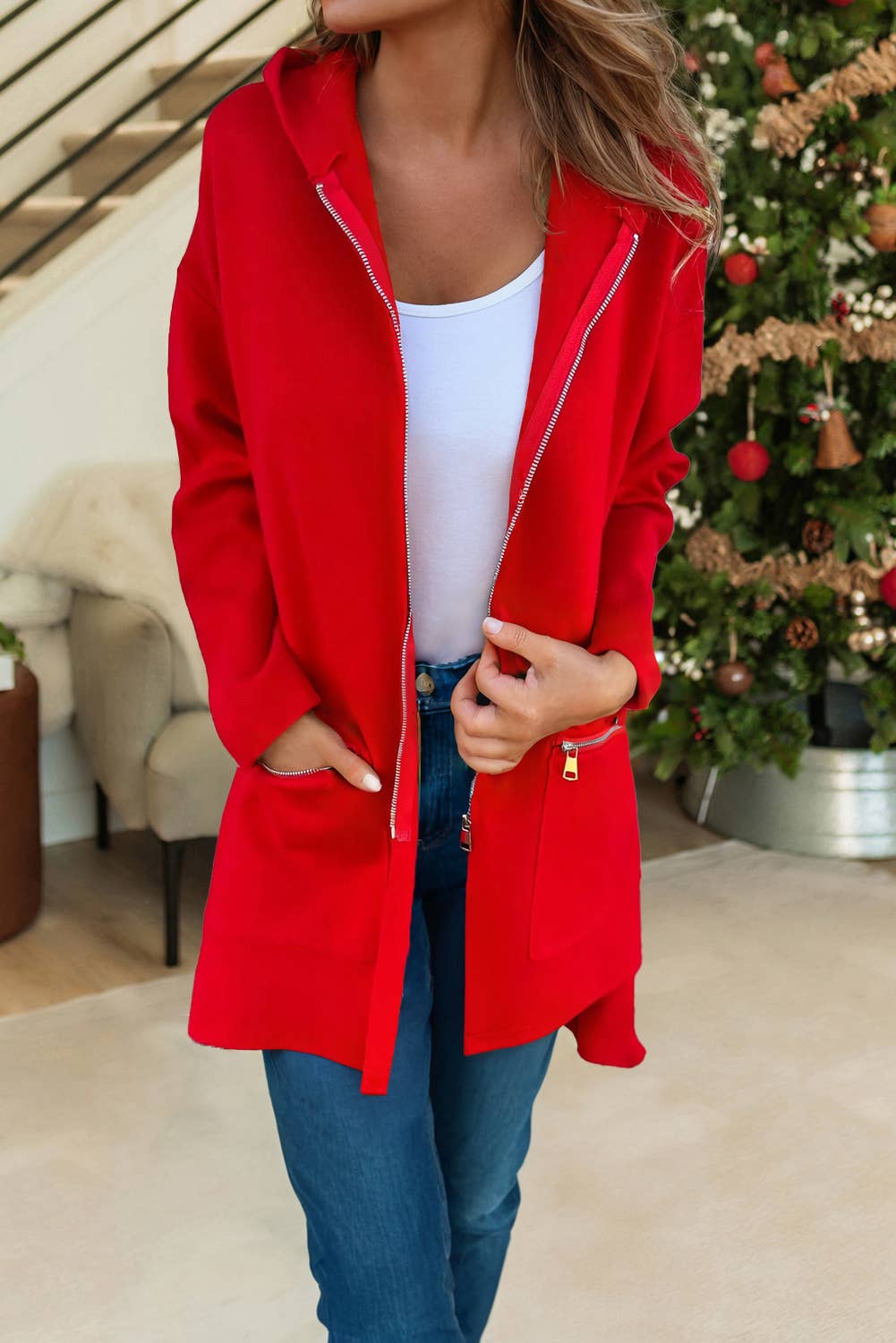 LDC Solid Color Casual Zip up Hooded Coat: Red