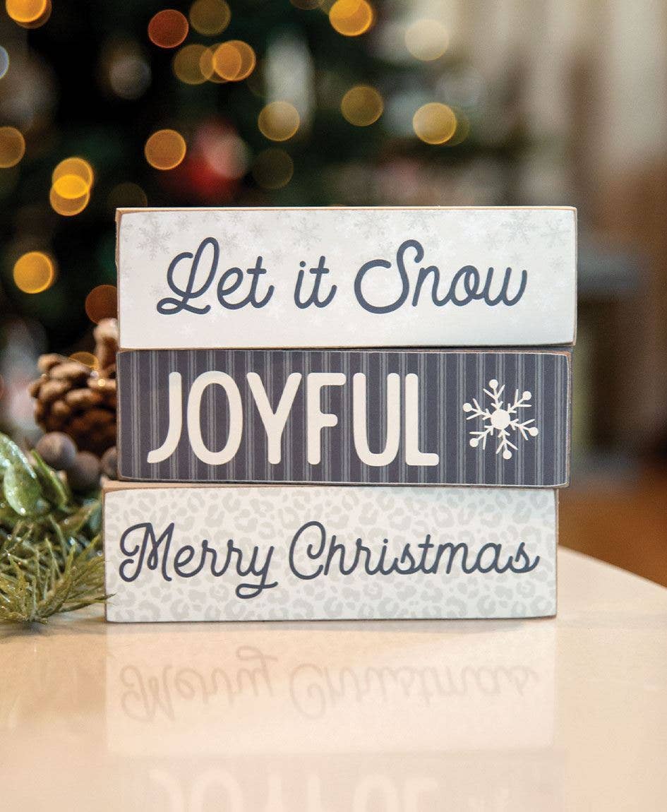 The Let It Snow Skinny Blocks are an assortment of three decorative wooden blocks with a wintry theme and natural wood edges. One block has a white snowflake graphic background and reads “Let it Snow” in blue scripted lettering. Another block has a blue striped background and reads “Joyful” in white lettering with a white snowflake graphic. The third block has a white leopard-print background and reads “Merry Christmas” in blue scripted lettering. These festive blocks display freestanding, perfect for placing on a tray, riser, windowsill, or tabletop for a fun and modern addition to the home during Winter and Christmas. Each block measures 1.5” high by 5” wide by .5” deep. Please note: This item features an assortment of designs which are priced and sold individually (not as a set). When you order a quantity of 18, you will receive 6 of each style. Color or design is not interchangeable.