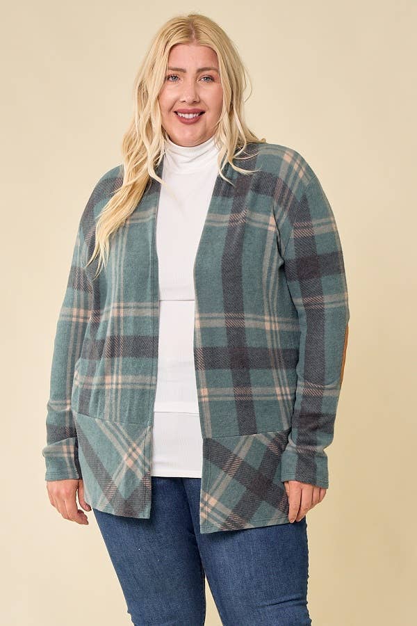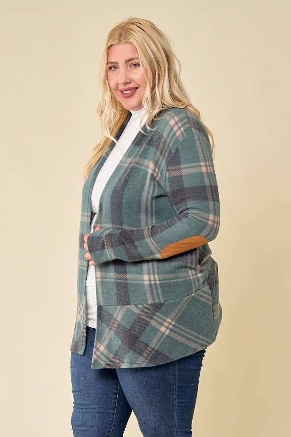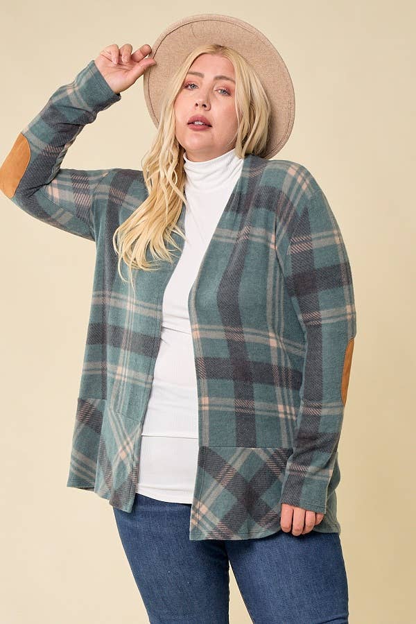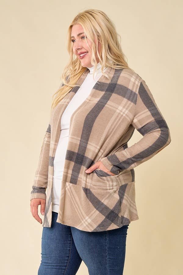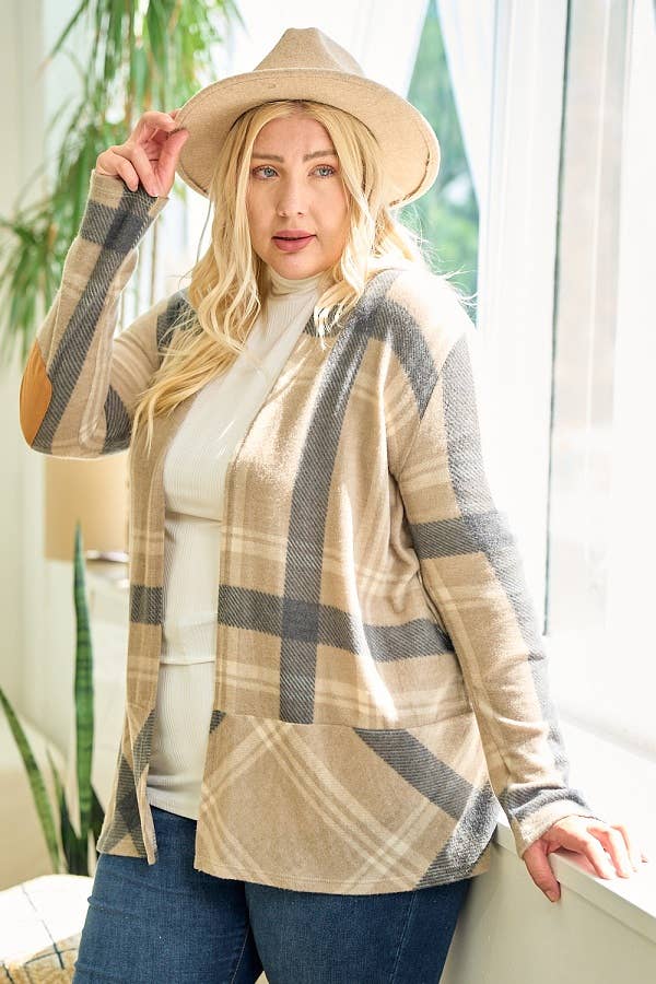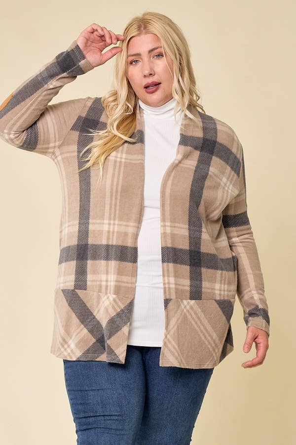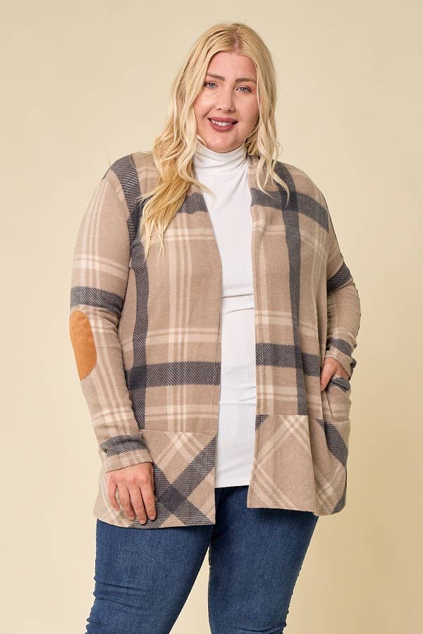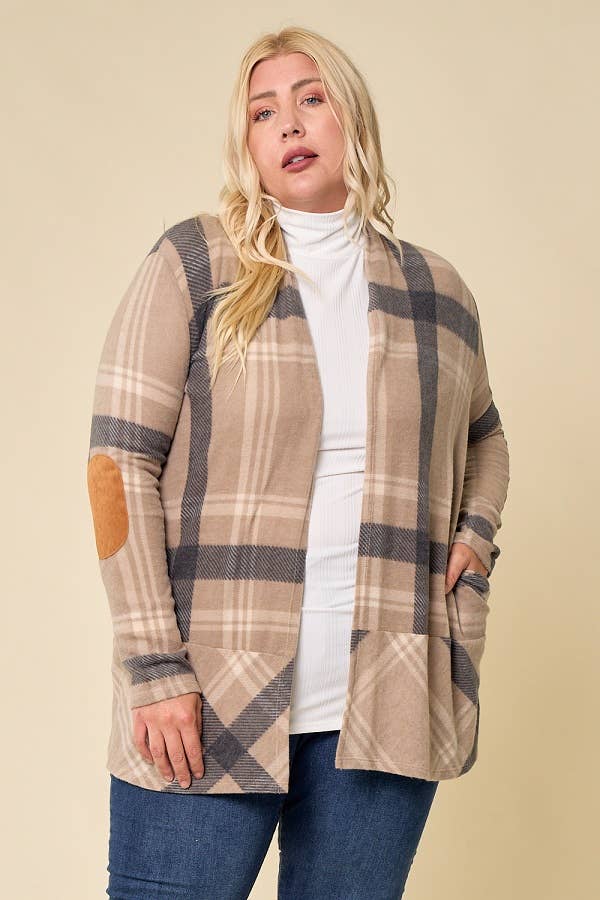 PLUS SIZE Brushed Hacci plaid cardigan featuring suede elbow patch details