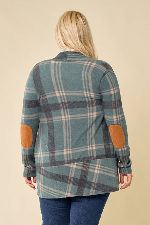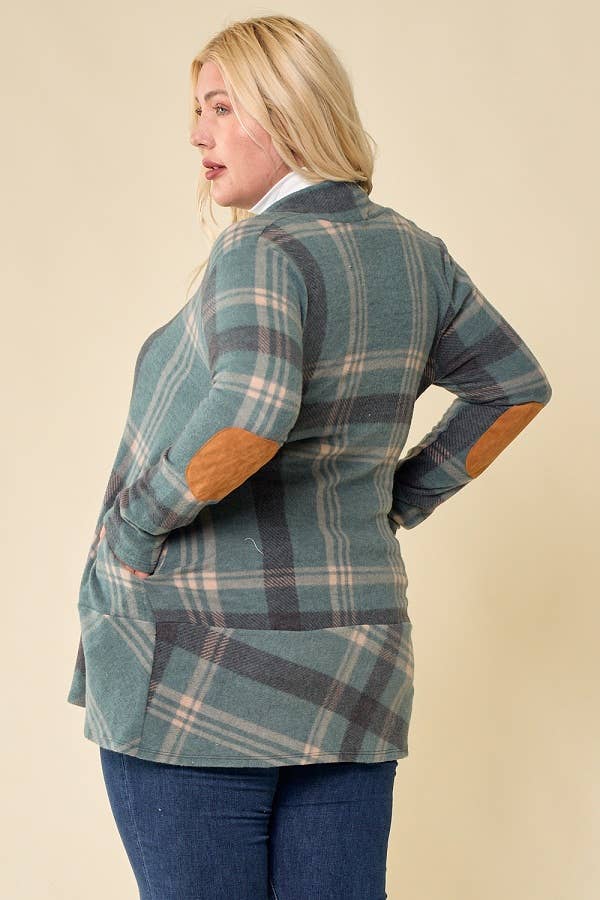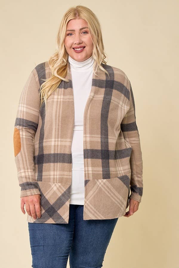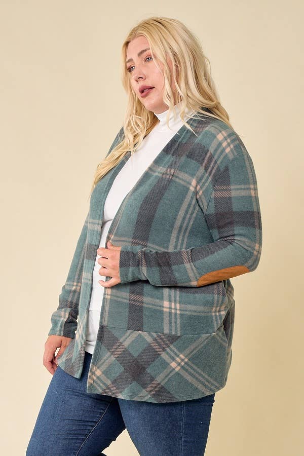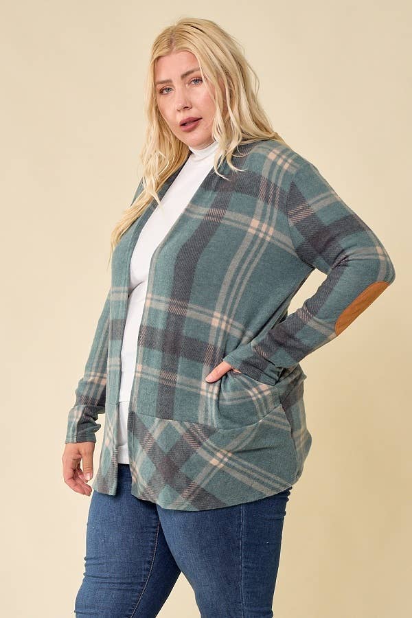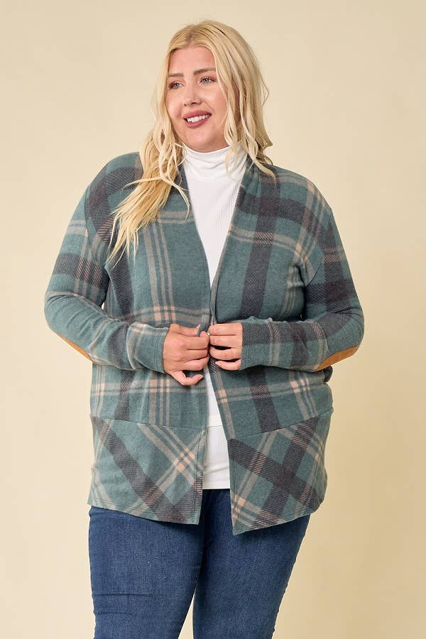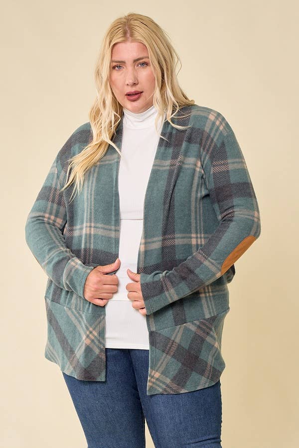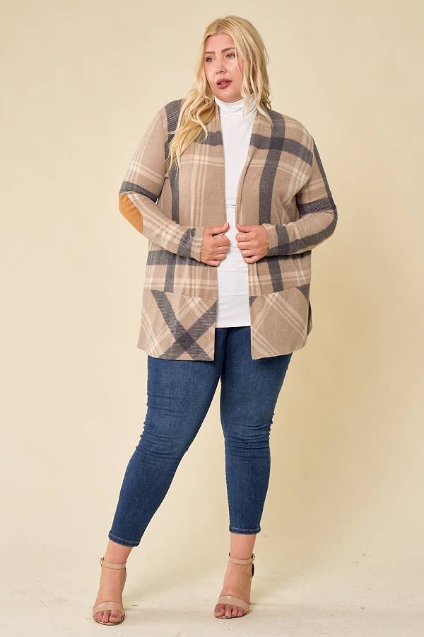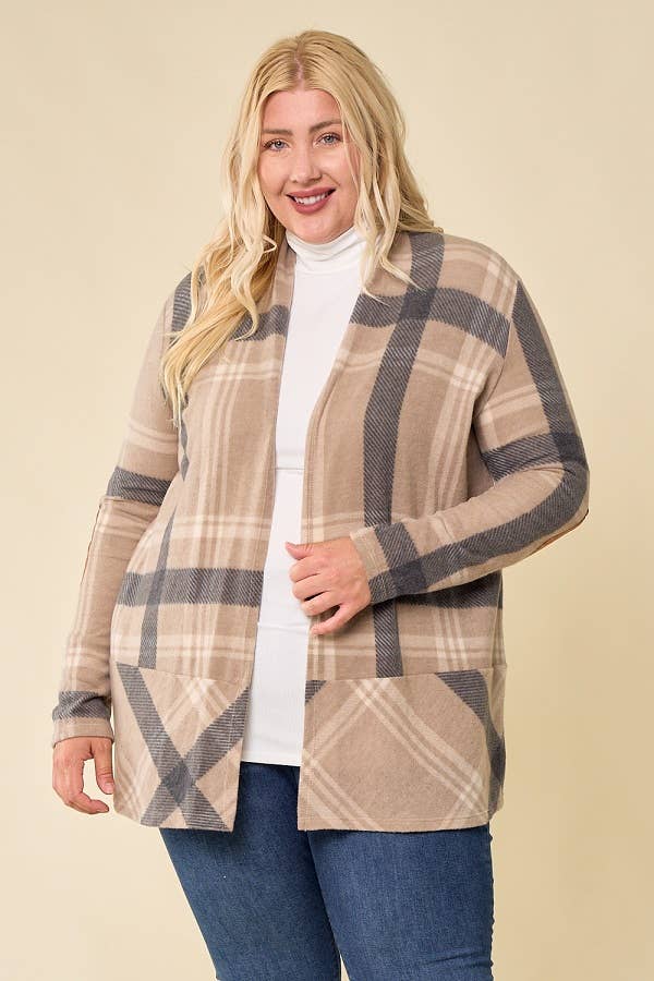PLUS SIZE Brushed Hacci plaid cardigan featuring suede elbow patch details