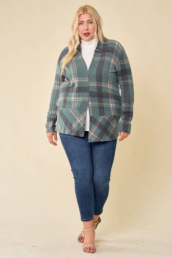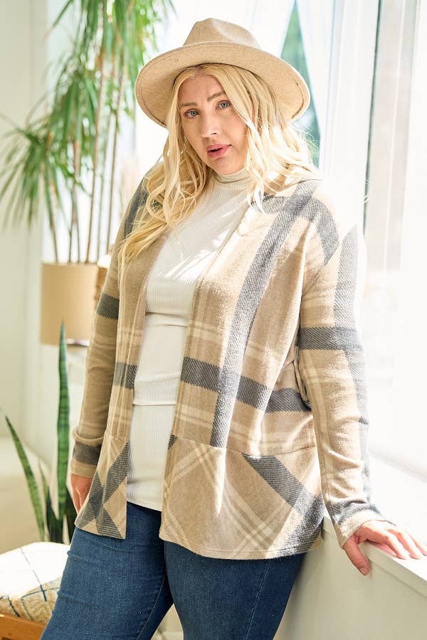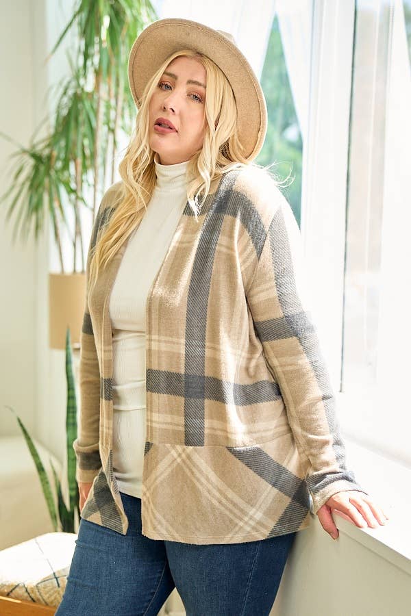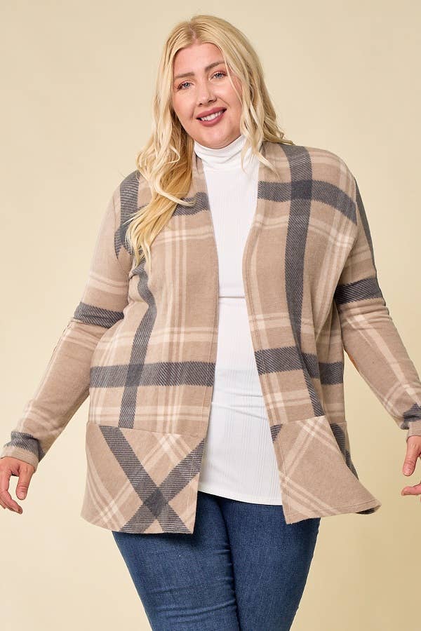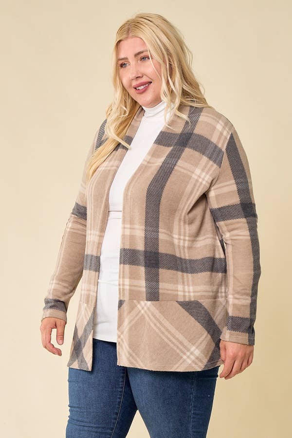 LMT2629PL-PLUS SIZE Hot Chocolate and Bon fired Plaid Cardi: TAUPE
