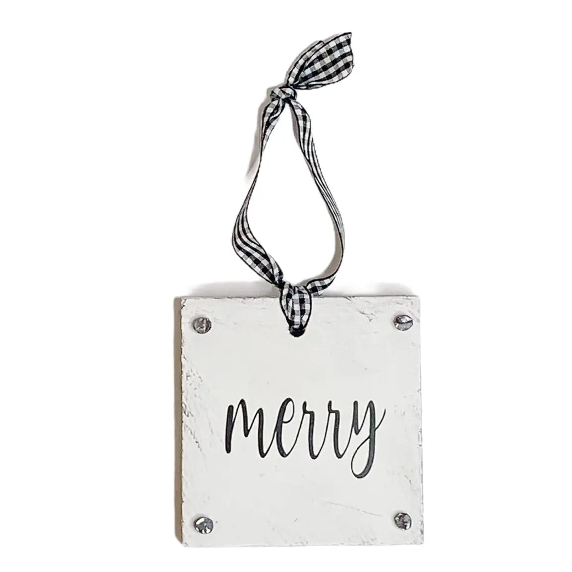 Beautiful white distressed wood ornament with light distressing. Black nail tacks and a black and white checked ribbon for hanging make this ornament a true treasure to share your faith on your Christmas tree.