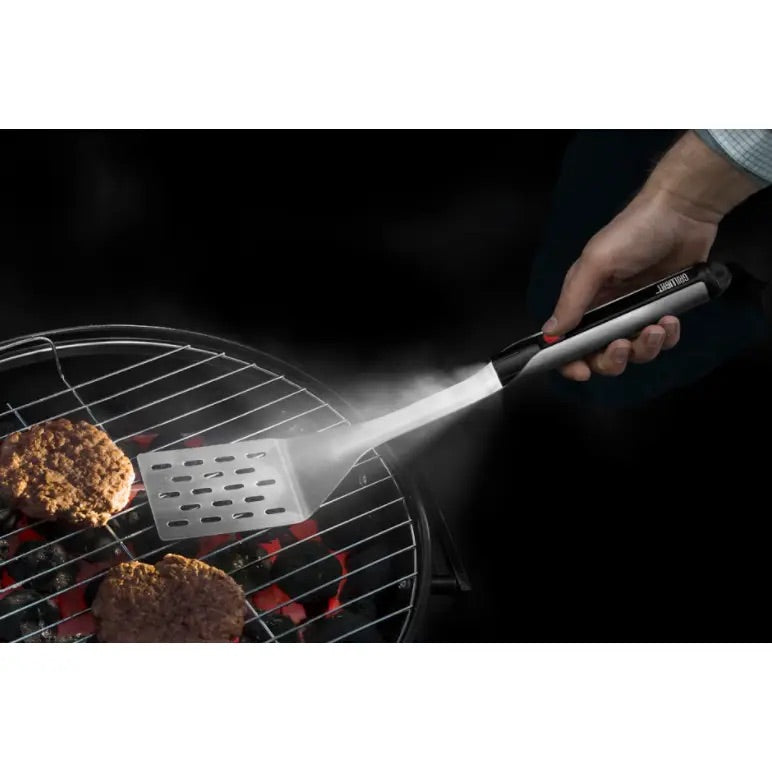 Grillight Premium Lighted Spatula. Premium 2 in 1 stainless steel grill spatula with built-in LED flashlight. Great for fall tailgates, evening BBQ, and camping. Restaurant grade stainless steel and custom flashlight with ideal illumination technology which perfectly replicates sunlight. Lifetime warranty. High-output Ideal Illumination™ LED flashlight built into handle 18? long Waterproof Flashlight Restaurant grade 304 stainless steel Dishwasher Safe