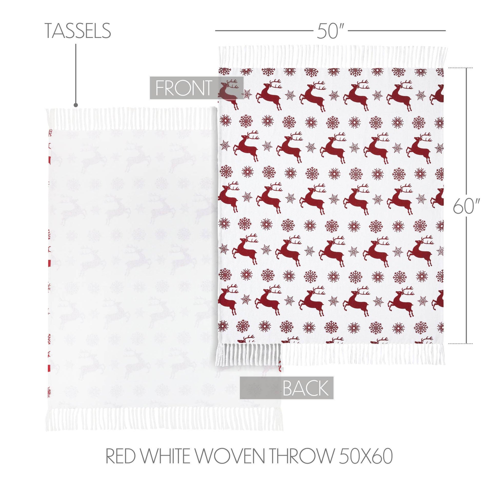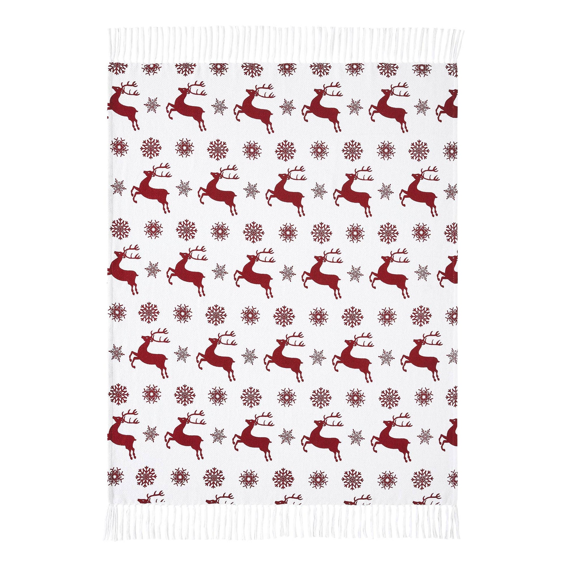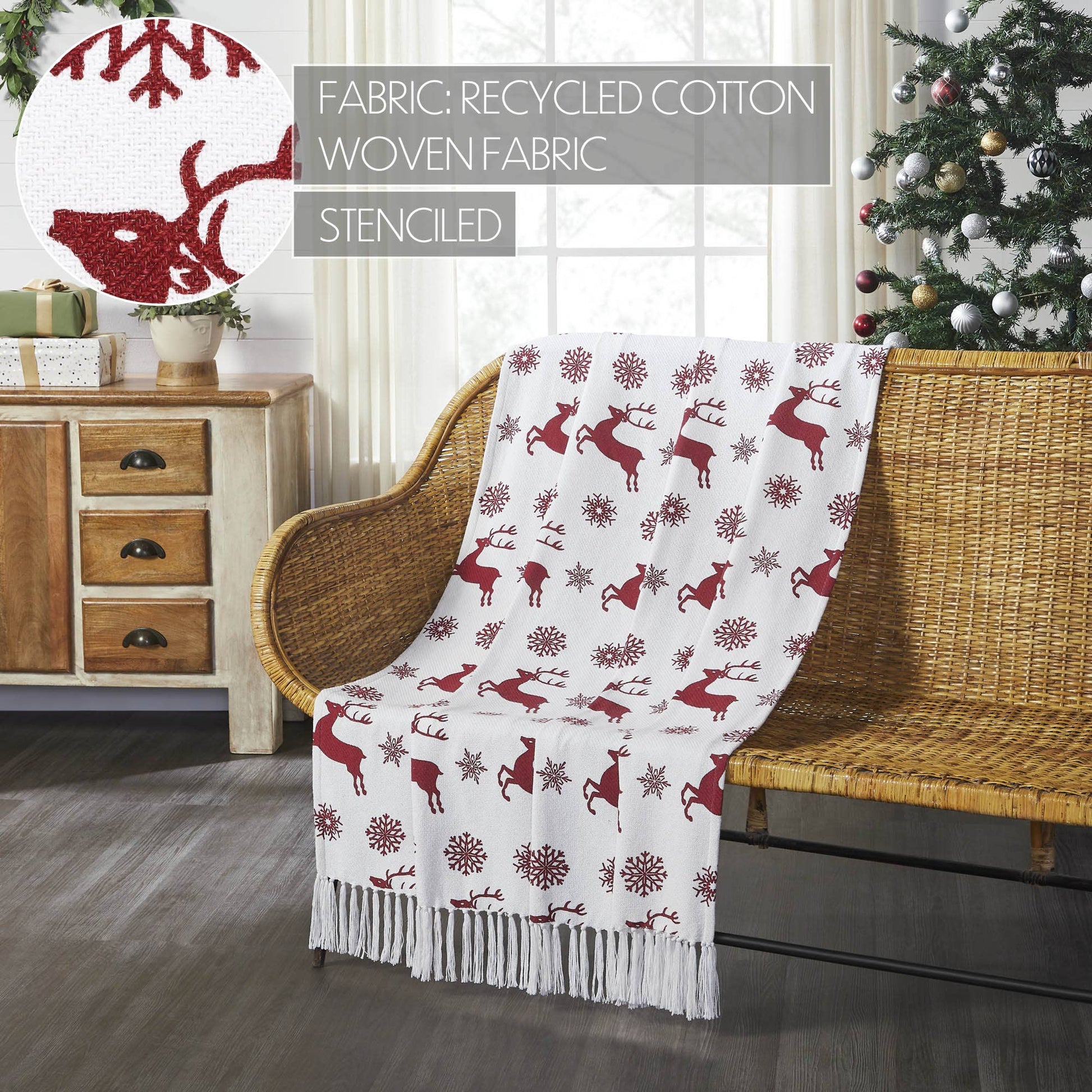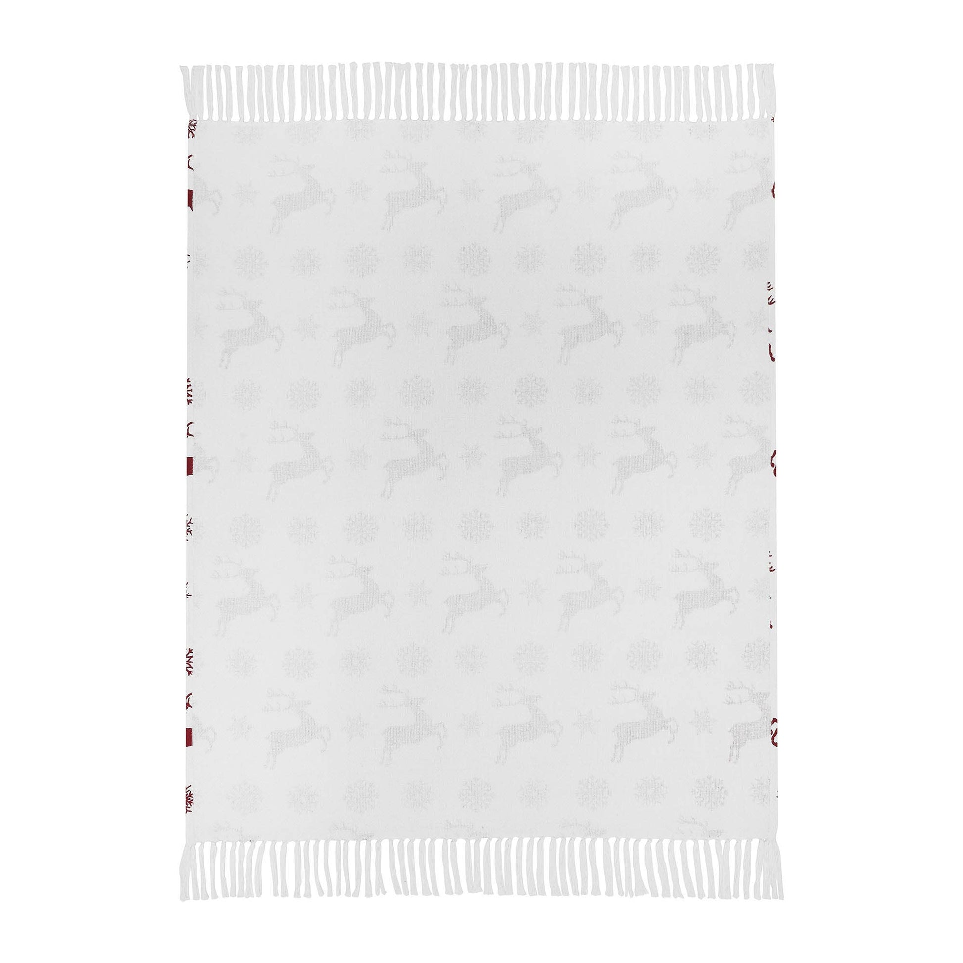 Transform your home into a cozy winter lodge with a fanciful pattern of classic red reindeer and snowflakes on a crisp white background. The Scandia Snowflake Throw measures 50x60 inches. The classic European country throw blanket is carefully crafted with a unique recycled cotton blend yarn. Tasseled edging adds an extra pop of texture. Coordinates with the Scandia Collection by VHC for Nordic Christmas style for your whole home.