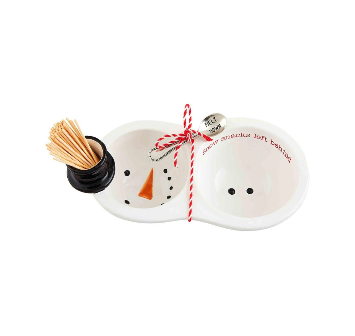 3-piece set. Hand-painted double dip snowman dish features top hat well to hold included toothpicks. Comes with stamped silverplate spoon.