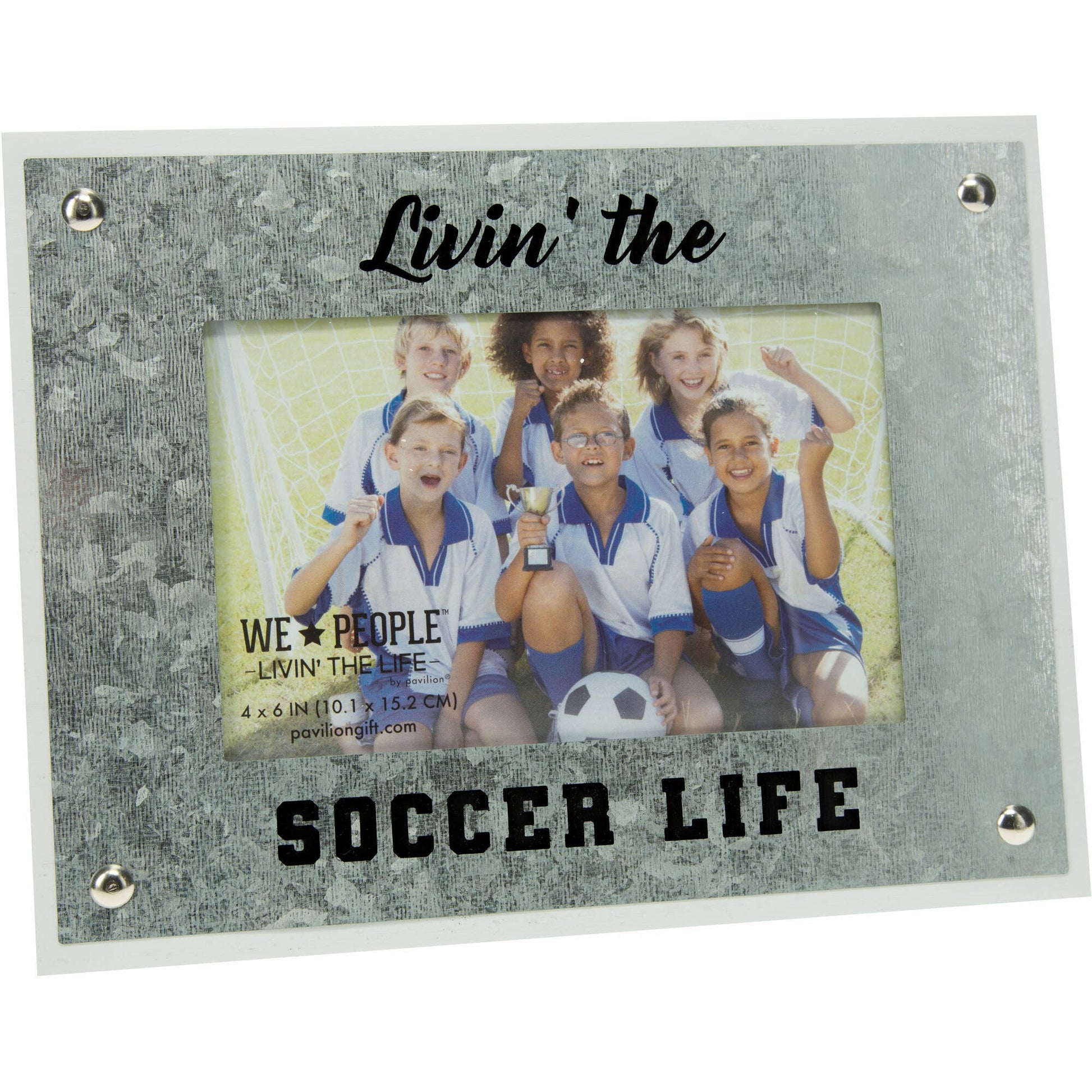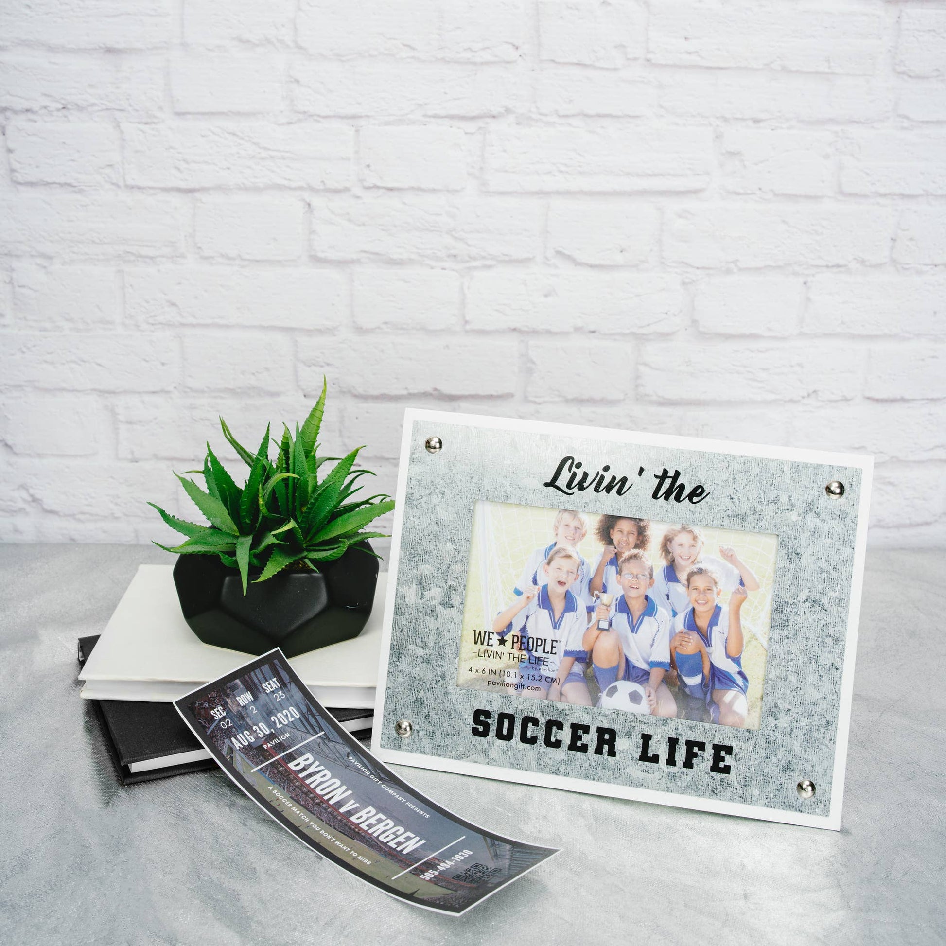 Photo frame, packaged in a plain box, is made from MDF, metal, and glass, fits a 4x6 inch photo, and features an easel back for displaying. "Livin' The Soccer Life" text is printed around the replaceable photo. Remove dust by wiping with a soft cloth. Great for those who wish to show their love of soccer.