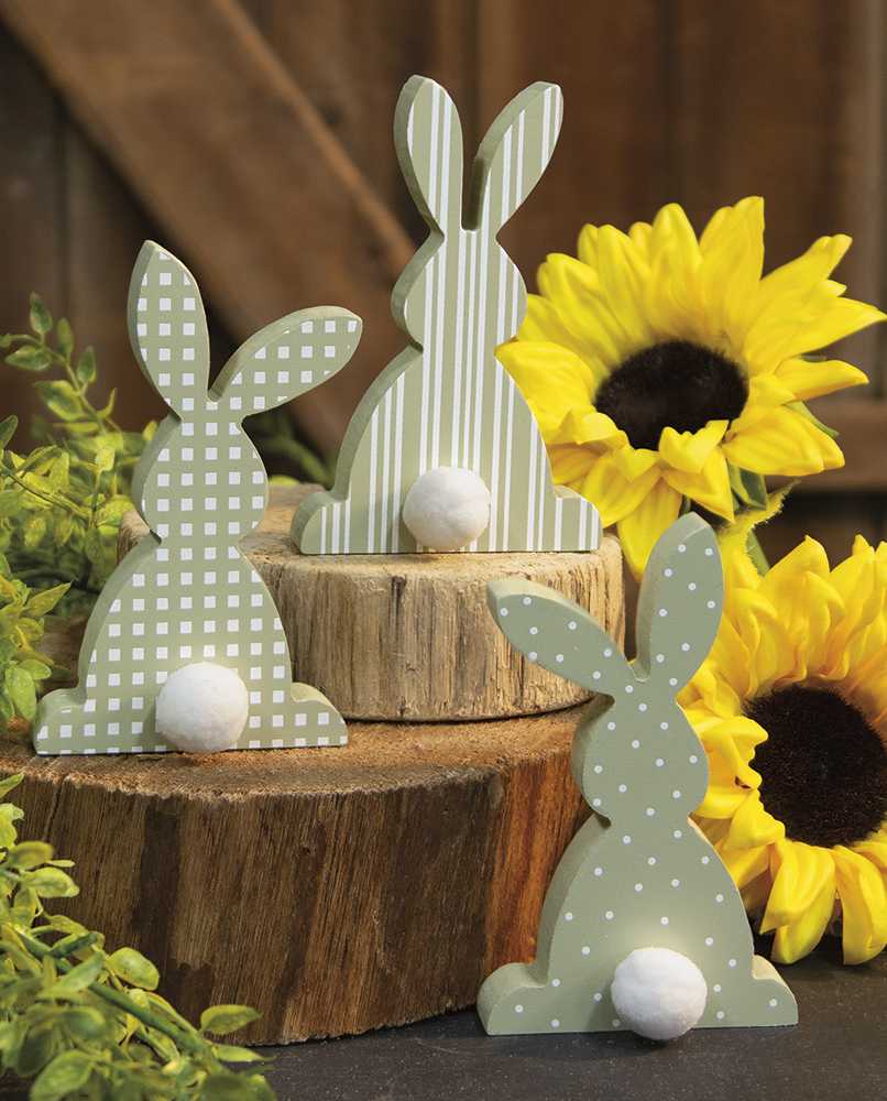 Spring Green Chunky Bunny is an assortment of three wooden bunny sitters. Bunny is freestanding and features a green finish with white stripes or polka dot accents that are perfect for complementing spring and Easter decor. Bunny has a cotton tail accent and looks great alone or paired together. Measures 3" wide by .75" deep by 5" high. Please note: This item features an assortment of designs which are priced individually, not as a set. When you order a quantity of 18, you will receive 6 of each design. Designs are not interchangeable.
