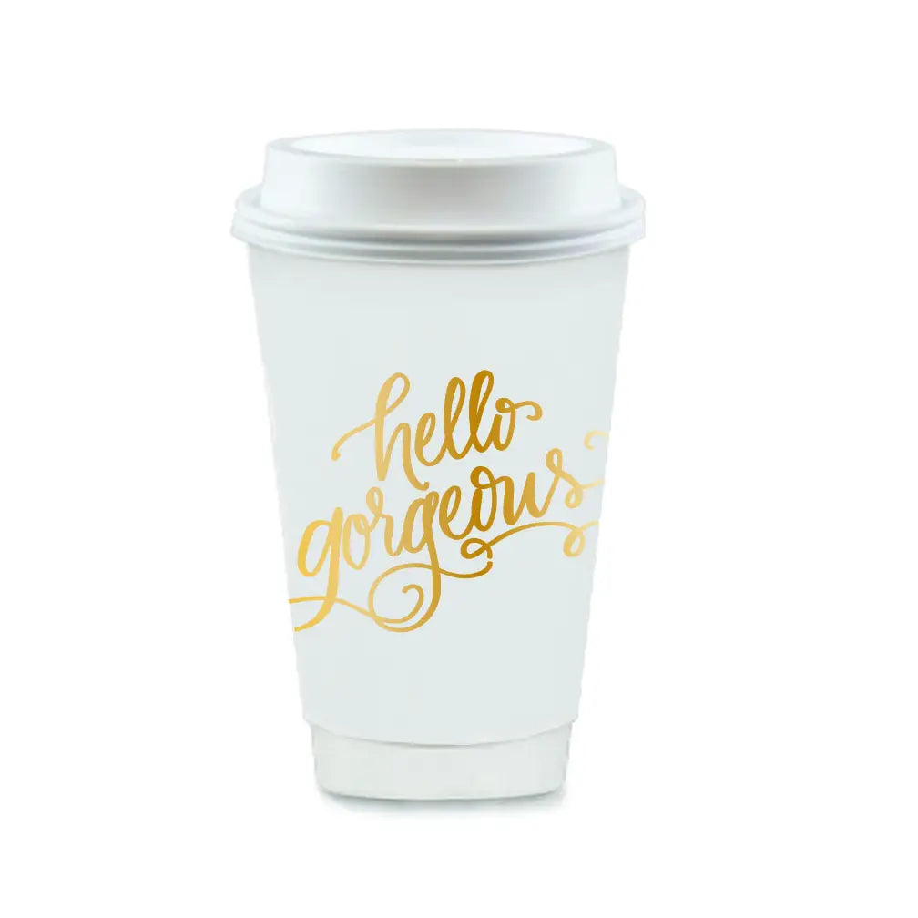 Hand-lettered "Hello Gorgeous" then printed on cups in metallic gold. To-Go Coffee cups feature a built-in sleeve to keep the drink insulated and hands from burning! Includes "sip" lids