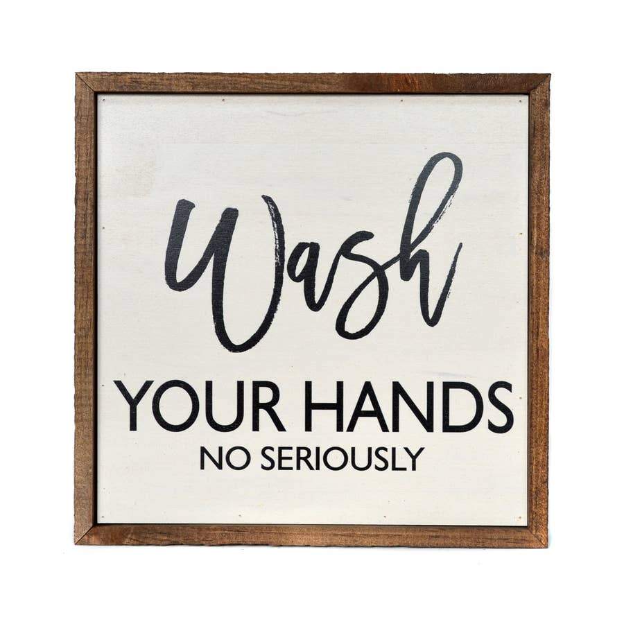 Wash Your Hands No Seriously Bathroom Sign. The signs are built into a wooden box frame with a rustic touch. Signs are hung directly off the frame or can stand alone.