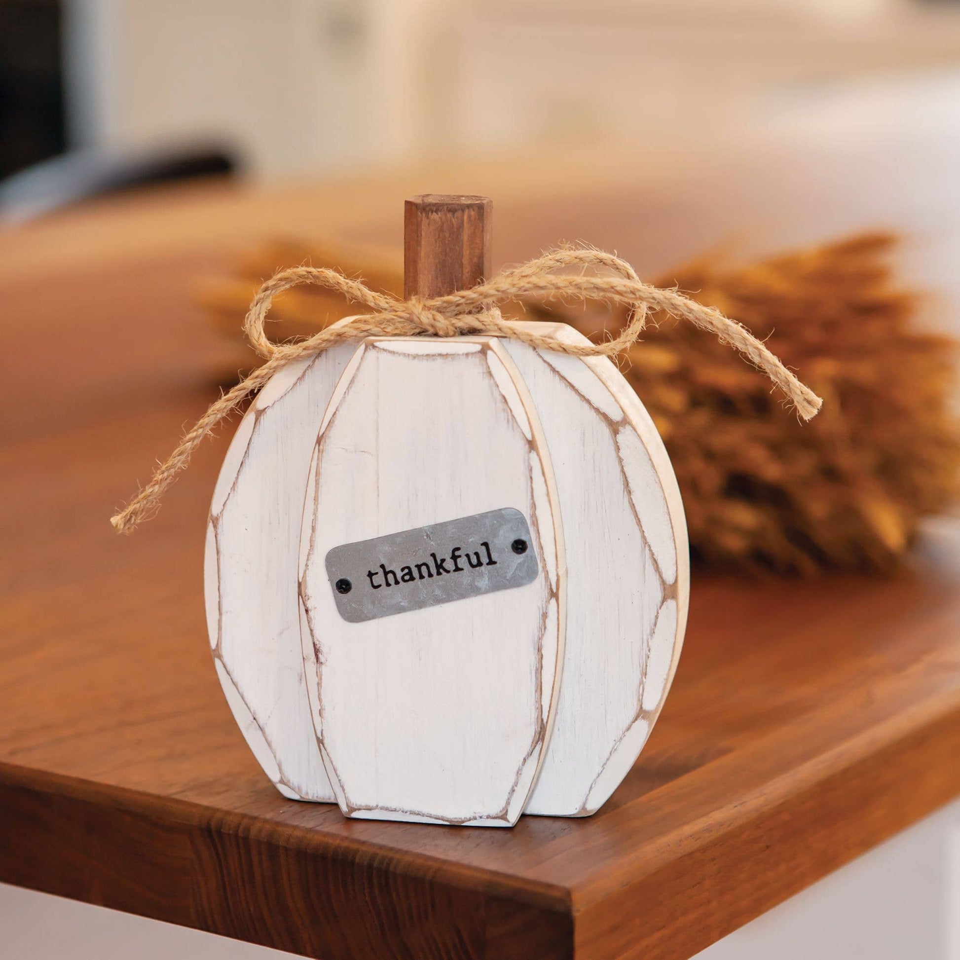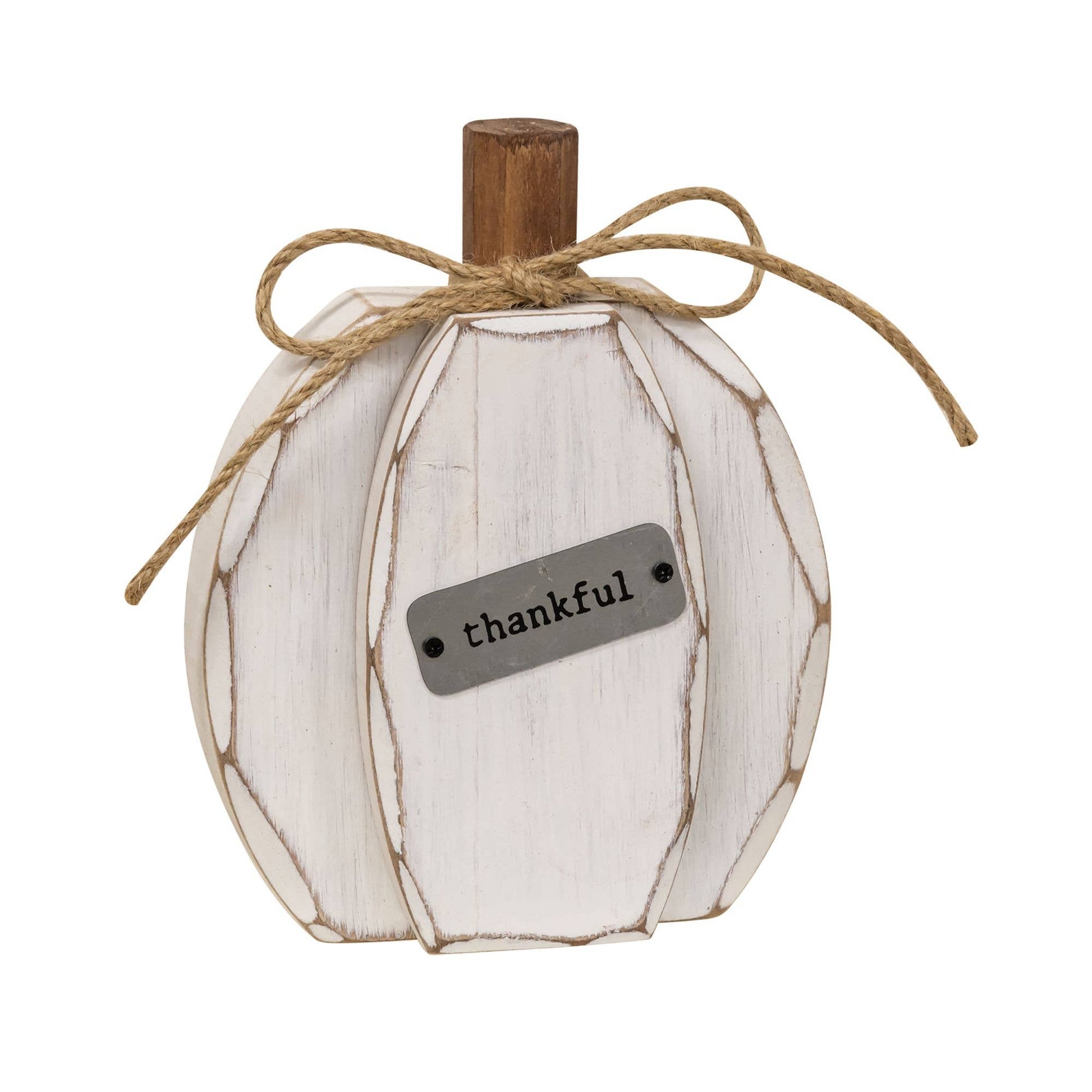Country charm meets farmhouse decor with the White Chunky Thankful Pumpkin Sitter. This beautiful wooden sitter in the shape of a pumpkin with a white finish and light distressing. A galvanized metal plaque is screwed to the front and reads, “Thankful”. It measures 6” high by 4.75” wide by 1.5” deep and has a simple jute string bow around the stem. Create beautiful tabletop displays by pairing sitter with your favorite fall accessories.