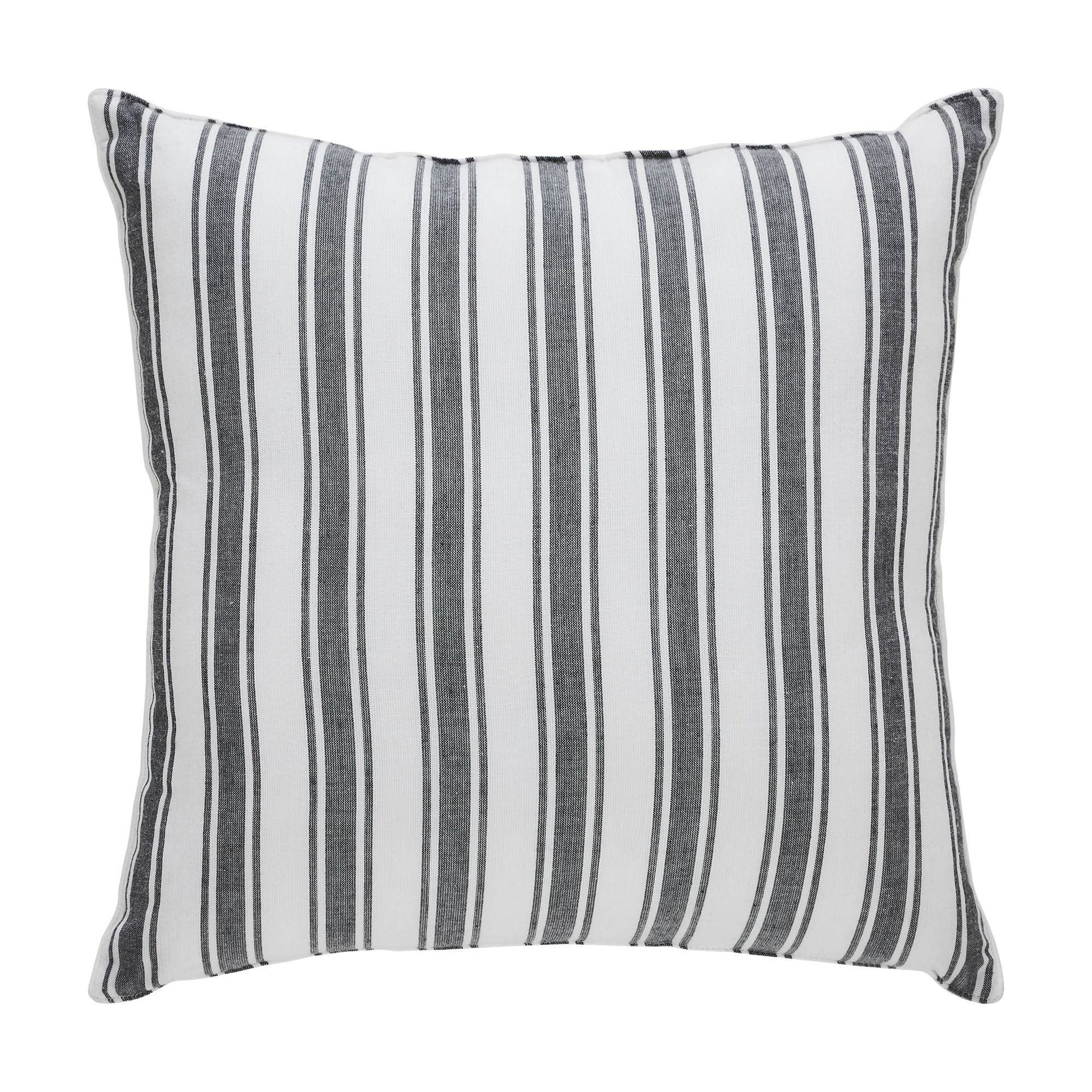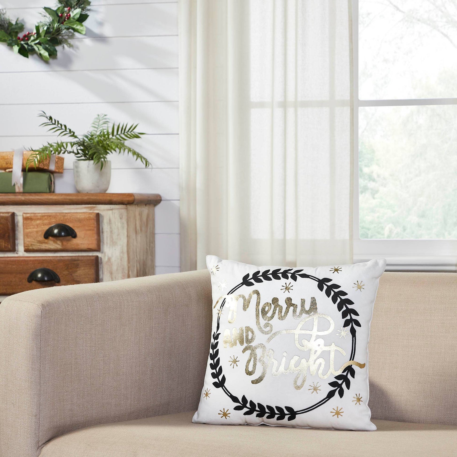 Add a bold and elegant touch to your Christmas decor with a black, white and gold theme. The Wintergleam Merry and Bright Pillow measures 14x14 inches and is made with 100 percent cotton. The front of the seasonal accent pillow features a wreath design printed in solid black surrounding a central block of text in gold foil reading, Merry and Bright in an elegant script. The filled pillow reverses to a black and white grain sack stripe. Coordinates with the Wintergleam Collection by VHC for bold and elegant Christmas style for the entire home.