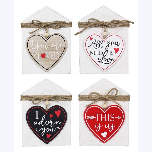 Wood House with Heart Shaped Sign with Rope. 4 Ast.