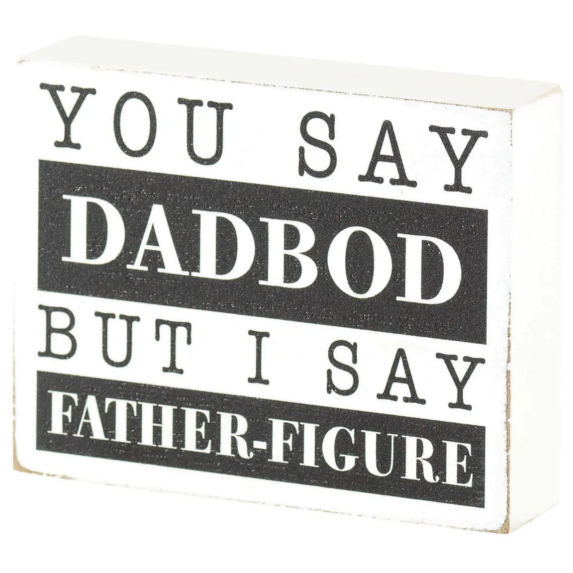 Small tabletop plaque fits in just about anywhere and offers a lighthearted look at fatherhood, along with an attractive design. Saying reads, "You say dadbod but I say father-figure." background has whitewashed finish; edges are distressed for a rustic appeal. Size is 4" x 3" x 1". Made of mdf wood